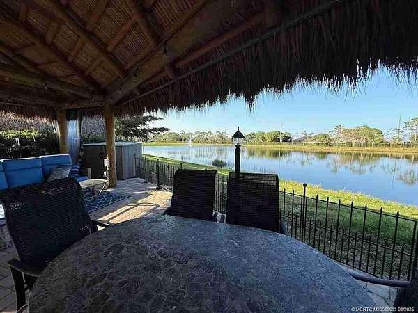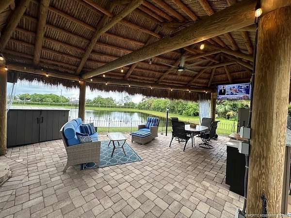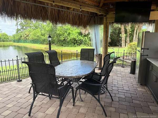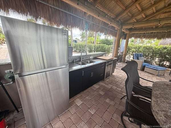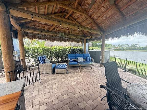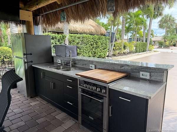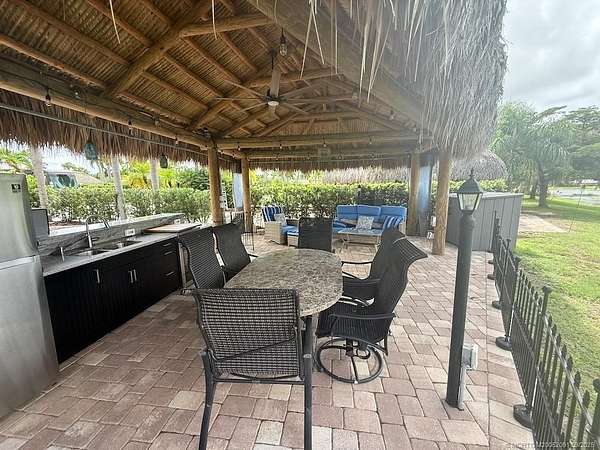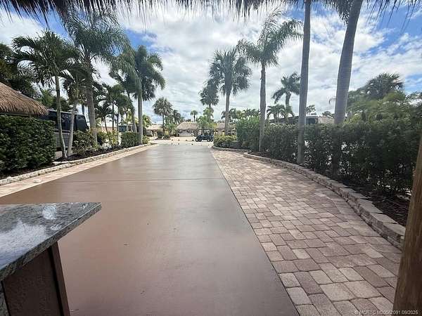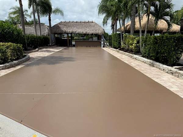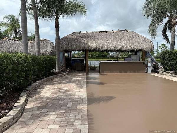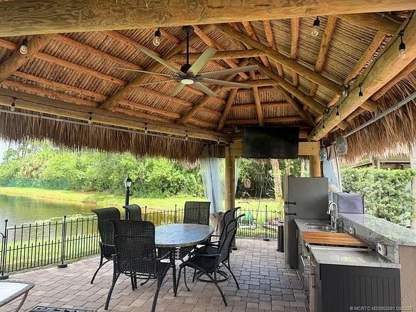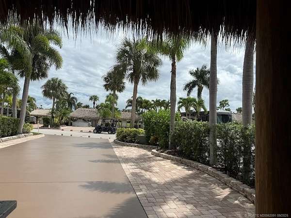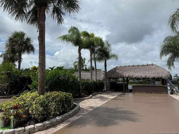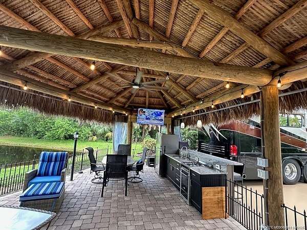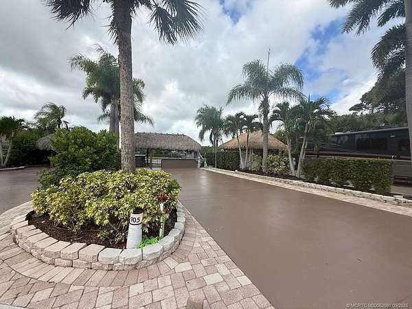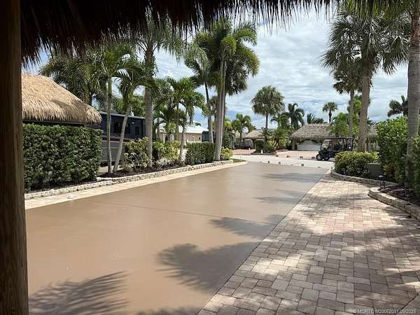 Discover the ultimate RV living experience with this lot, featuring a spacious L-shaped tiki hut and top-of-the-line amenities. The lot backs onto the large, natural lake and includes additional landscaping, ensuring a serene and secluded setting. Contemporary pavers, raised landscape walls, and mature plantings create a welcoming and polished look and the large tiki hut built in 2021 provides outdoor living space and features an outdoor Kitchen with composite cabinets featuring slide-out shelves, soft-close doors, and drawers and sleek granite countertops and a bar top, it's a chef's paradise with the Magic Chef 4-burner gas range with convection oven and Magic Chef countertop microwave and a Samsung stainless steel refrigerator with ice maker. The Tiki has a dedicated 60-amp circuit, tankless water heater, a 72" remote ceiling fan with light, flat mounted 55" flat-panel TV and eisenglass curtains. Sold fully furnished, including a removable dog fence and large storage unit.