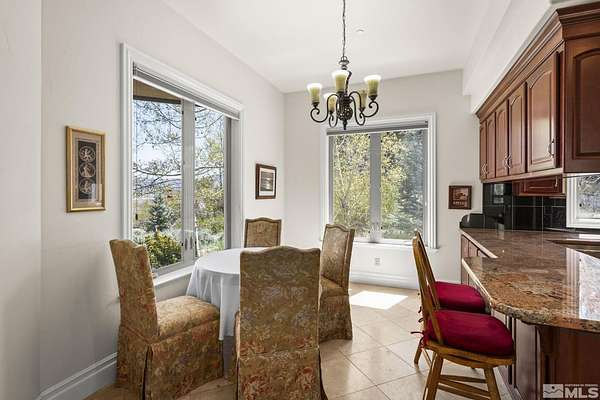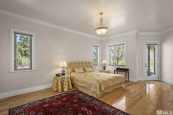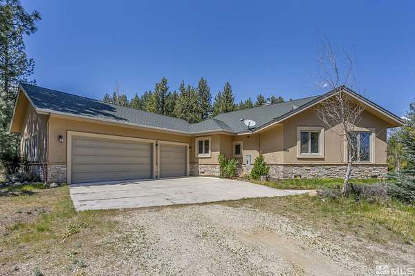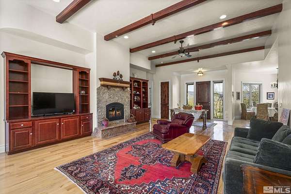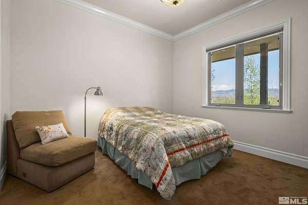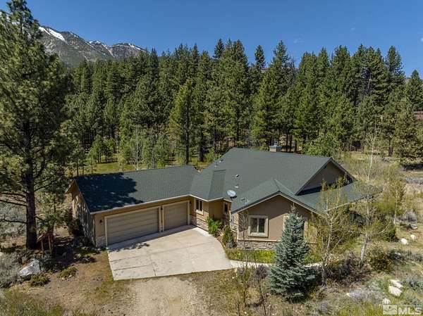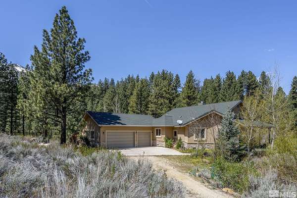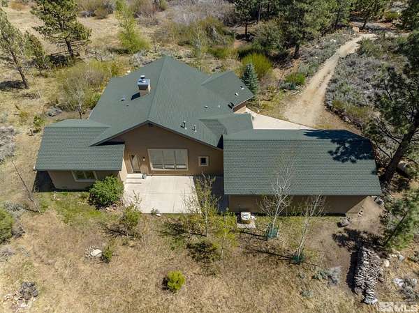 Nestled on 2.7 private acres at the base of Slide Mountain, this stunning custom home offers unmatched views and tranquility. Expansive picture windows frame breathtaking mountain peaks and serene snowfall, all from the comfort of your living room beside a cozy fireplace. Enjoy morning coffee in the breakfast nook while taking in views of Washoe Lake. Surrounded by mature trees and the peaceful sounds of nature, the outdoor patio is the perfect retreat to unwind and listen to the breeze in the trees. The home features two spacious bedrooms, a dedicated office, and an open-concept floor plan ideal for entertaining. Rich wood floors, custom built-ins, wood ceiling beams, and 8-foot wood interior doors create a warm, grounded aesthetic that perfectly complements the forested landscape. A 4-car garage offers plenty of space for all your needs. It offers the convenience of a little more than a stone's throw from Davis Creek Park, and easy access to Reno and Carson City. A rare opportunity to own a slice of Sierra Nevada beauty!