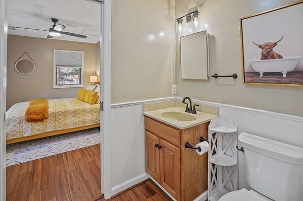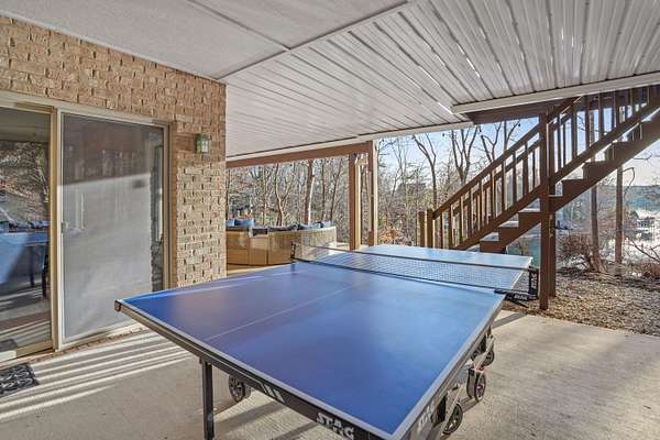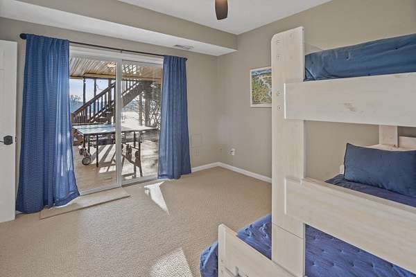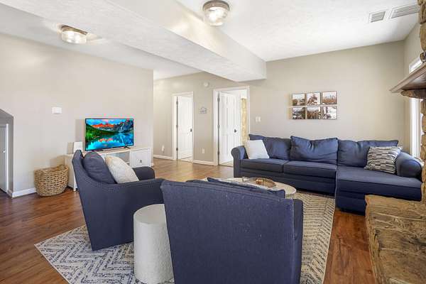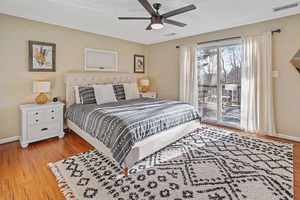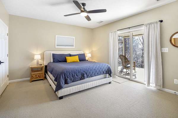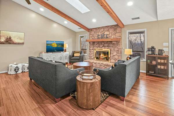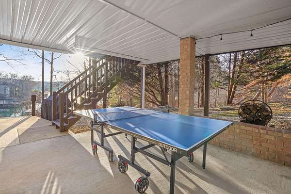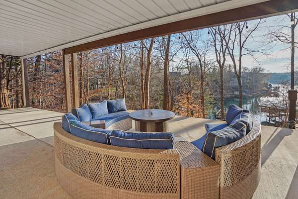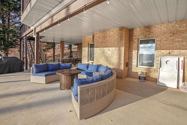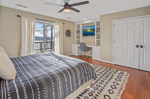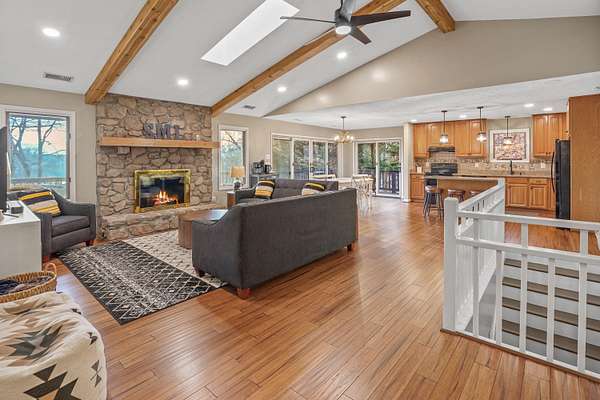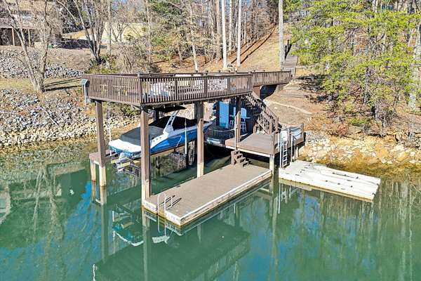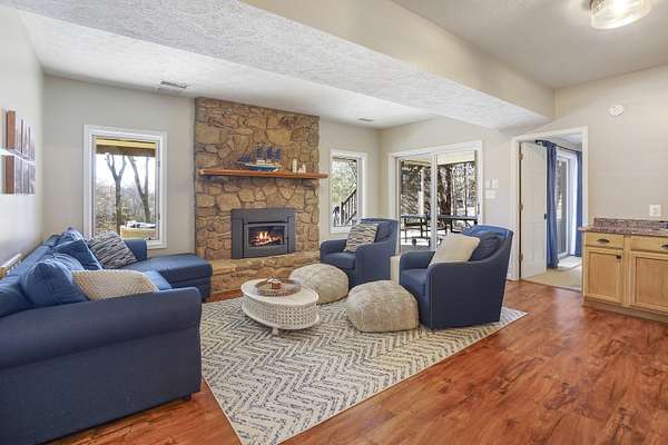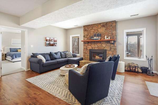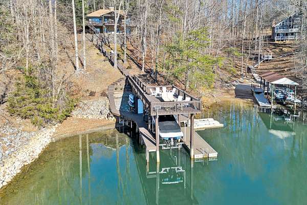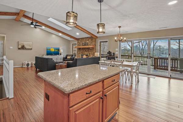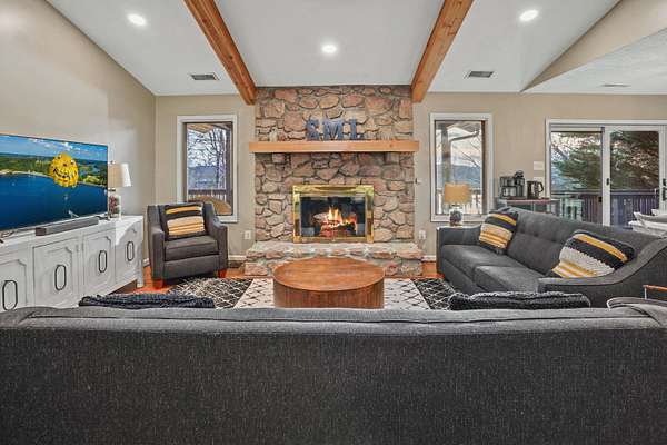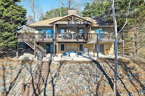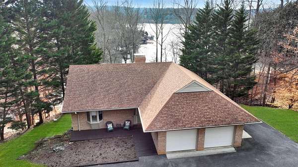 Impressive investment Property with this lakefront brick contemporary ranch nestled on a double lot (1.59 acres) & already on the short term rental program. Sold almost fully furnished w/ some items that do not convey. This lake home has been almost totally updated. Open concept plan: Great Room with cathedral ceiling, new cedar wood beams, & gas fireplace. Kitchen w/granite countertops & island. 4 bedrooms (including a second primary bedroom on the lower level) & 3 full baths. Family Room w/wood burning fireplace & wetbar. Perfect for your morning coffee overlooking the lake or enjoy the beautiful evening sunsets on the huge covered deck. Spacious double car garage. Fabulous dock w/party deck, quiet cove, and long views just off the main channel. Only 10 minutes to restaurants & shopping