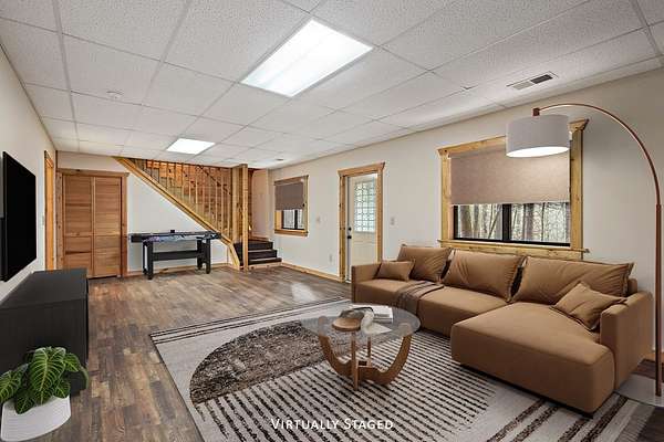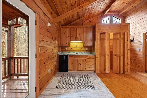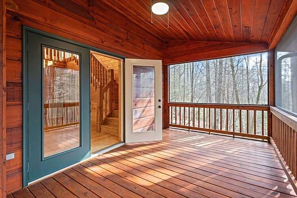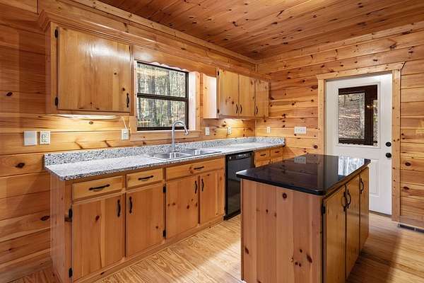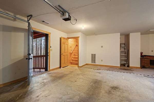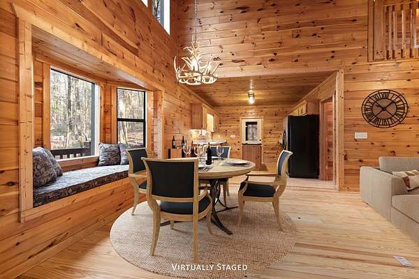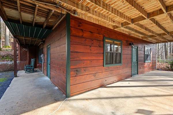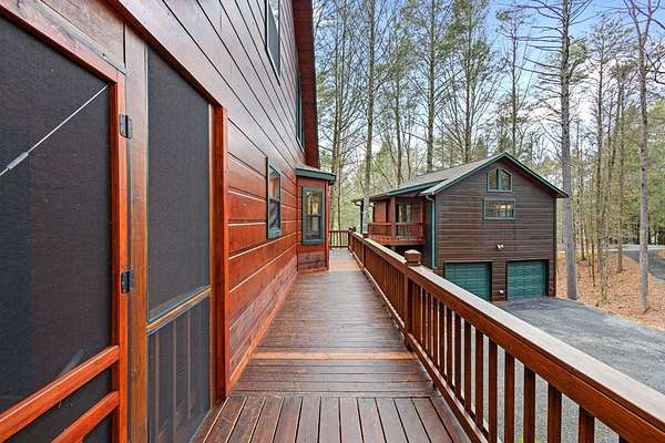 Nestled along the Ellijay River in the coveted, gated Goose Island Hide Away community, this expanded mountain retreat offers the rare combination of acreage, privacy, and convenience between Blue Ridge and Ellijay. Set on approximately 2.64 acres of gentle, usable land with beautiful hardwoods and easy community river access, the property feels like a private retreat, yet sits on all paved, wide community roads with underground utilities and is surrounded by neighboring million-dollar homes. The main residence is a warm, lodge-style home with pine interiors, a full finished basement, and generous square footage designed for comfortable full-time living or a luxurious mountain getaway. Multiple indoor and outdoor living areas flow to expansive decks and porches that overlook the wooded grounds, creating an inviting space for relaxing, entertaining, wildlife viewing or watching the seasons change. The full basement offers additional flexible living space ideal for media, game, or bunk areas, giving everyone room to spread out.[ A major value add is the oversized detached garage with an impressive finished upper-level studio apartment/guest suite/artist studio, complete with its own living, sleeping, and kitchenette-ready space. This separate suite is perfect for extended family, guests, or creative work, and pairs with the main home's generous heated square footage to offer significantly more space than many nearby properties.(over 3000 sqft) Outdoor lovers will appreciate the easy walk to the river, the usable acreage for gardening, fire pits, or pets, and the serene setting tucked back from the road. Goose Island's gated entry, wide paved roads, and attractive streetscape of high-end cabins and river homes create a polished yet relaxed community feel. With its combination of acreage, river access, paved and gated infrastructure, substantial square footage, detached garage, and private studio-style guest quarters, this property stands out as a premier offering in