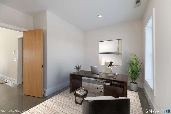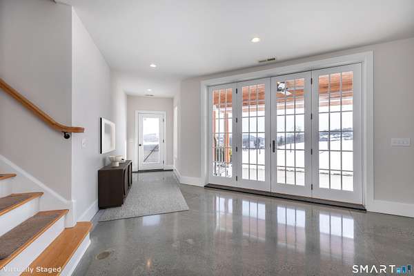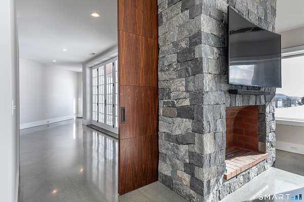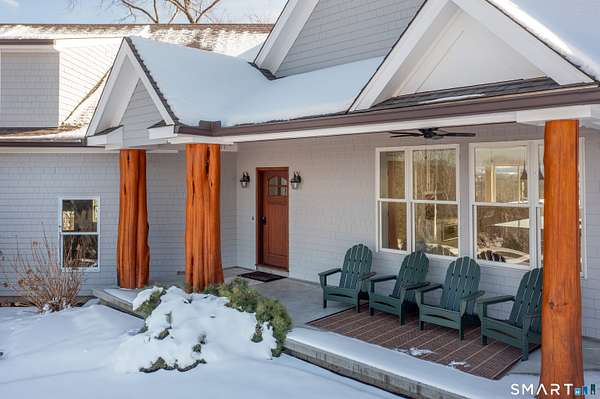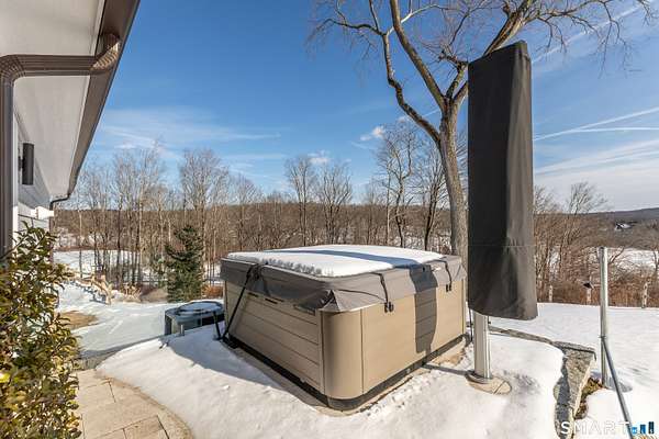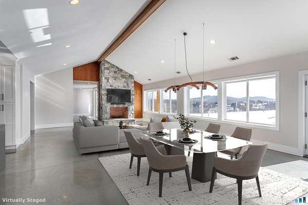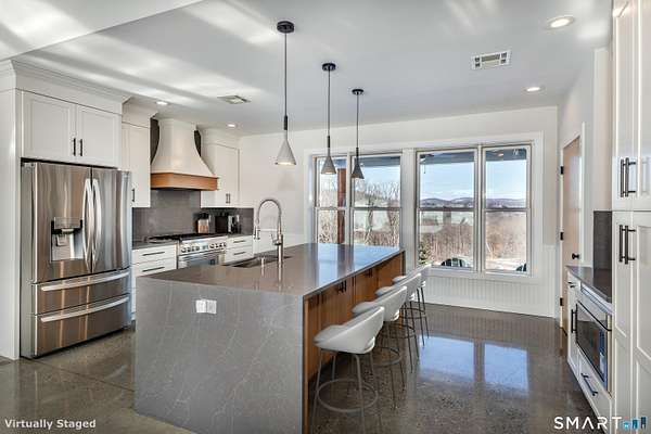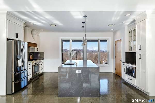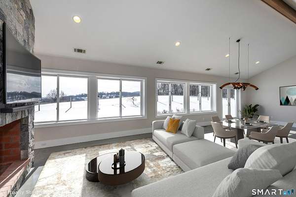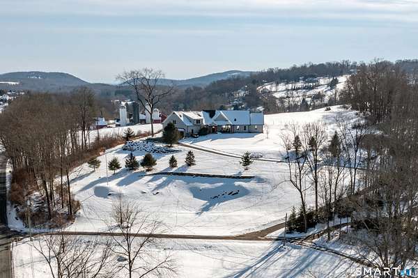 Beautifully sited on a gentle rise, this striking Contemporary commands sweeping panoramic views of the surrounding landscape. The home overlooks the iconic Happy Acres Farm, permanently preserved by the Town of Sherman, ensuring timeless pastoral vistas. The open floor plan features three bedrooms, including a main-level primary suite, three full and two half baths, a main-level study, and a dramatic living/dining space with vaulted ceilings and a stone-faced, double-sided bio-ethanol fireplace. The sleek kitchen includes quartz countertops, bar seating, a walk-in pantry, and top-tier SS appliances. The main level's polished concrete floors and walls of oversized windows frame stunning front and rear views, filling the home with natural light. Upstairs are two en suite bedrooms with a large, shared sitting/playroom. Additional features include a walk-up attic with excellent expansion potential, radiant heat throughout the home and three-car garage, plus a separate laundry room. Outdoor living is equally inviting with an eight-person hot tub overlooking the rolling countryside and French doors opening to a covered patio with an outdoor fireplace. There is also your own golf tee! Freshly stained exteriors and newly painted interiors create an elegant, turnkey, move-in-ready residence. Ideally located just 90 minutes from Manhattan and minutes to NYC trains.