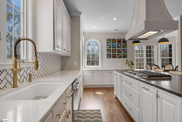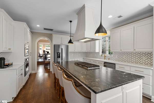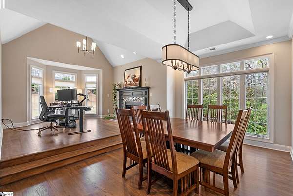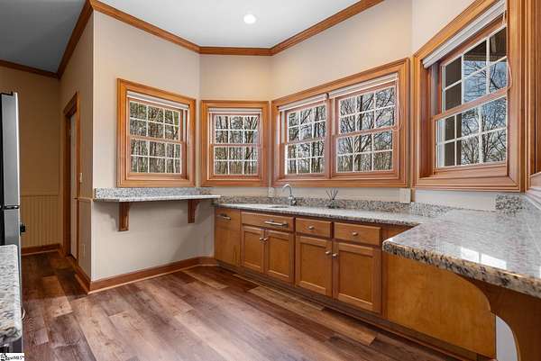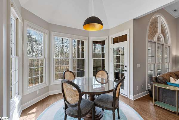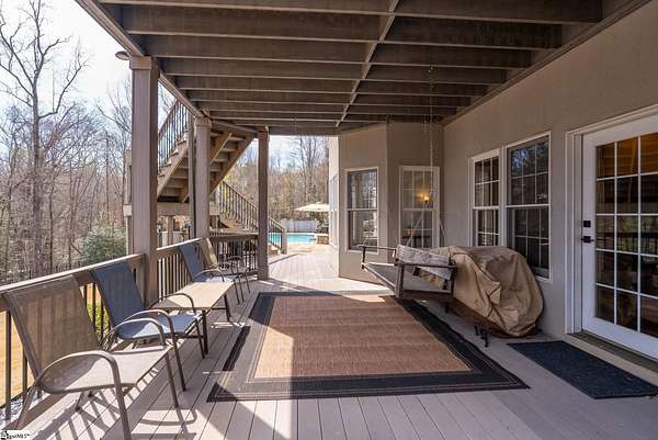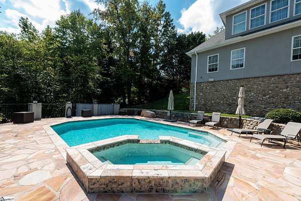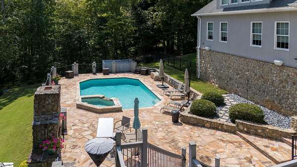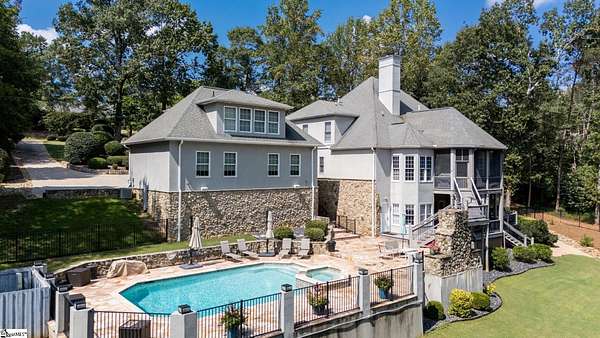 Set on 2.5 beautifully manicured acres with a serene, wooded backdrop, this exceptional property offers the perfect blend of elegance, comfort, and versatility. The main residence features 4 bedrooms and 3.5 baths, including a spacious primary suite on the main level with a charming bay window and private en suite bath. The thoughtfully designed floor plan includes a light-filled study just off the dining area, complete with a cozy fireplace and expansive windows that invite in natural light. The kitchen is both stylish and functional, showcasing a large island, tasteful finishes, and a breakfast room overlooking the peaceful landscape—where deer and wild turkeys are frequent visitors beyond the fence line. Upstairs, two bedrooms are connected by a convenient Jack-and-Jill bath, ideal for family or guests. Designed for both relaxation and entertaining, the outdoor living space is truly special. Enjoy a stunning pool and spa surrounded by a stone deck, along with a striking outdoor stone fireplace—perfect for gathering year-round. The fully finished basement adds incredible flexibility, featuring a private en suite bedroom with its own entrance and kitchen—ideal for an in-law suite or extended stay guests. Additional basement space includes a dedicated home gym area and a large recreation or living space. Enjoy peace of mind when storms roll through causing power outages because this home comes with a generator. What truly sets this property apart is the detached garage with a fully finished apartment above, complete with a full bath and kitchenette—offering excellent potential for rental income, guest accommodations, or a private retreat. With an attached garage, a detached garage apartment, expansive outdoor amenities, and a setting rich in natural beauty, this one-of-a-kind property is perfectly suited for multi-generational living, entertaining, income generating or simply enjoying a peaceful lifestyle.
