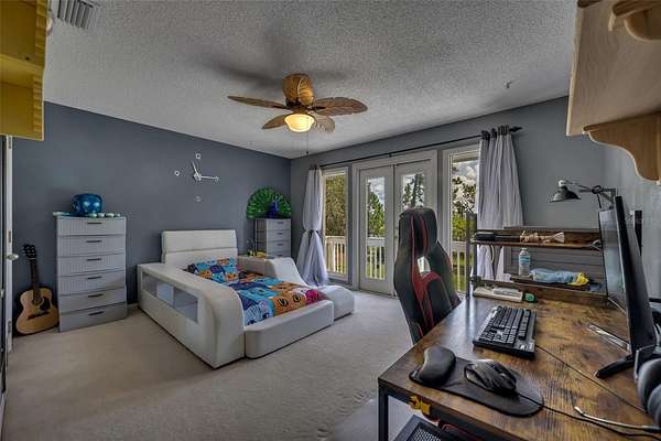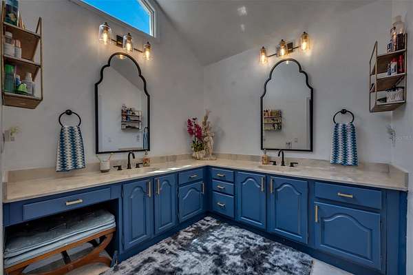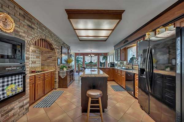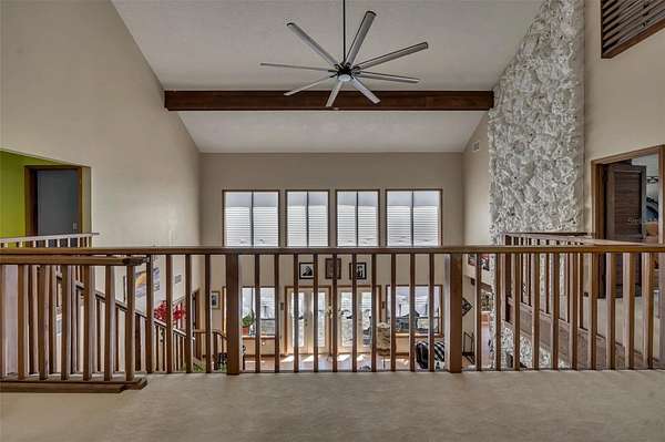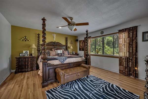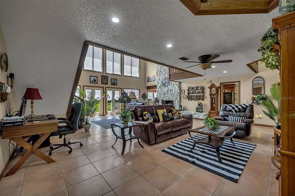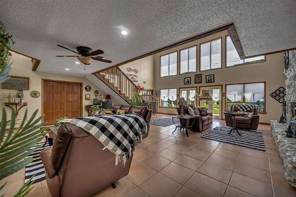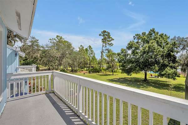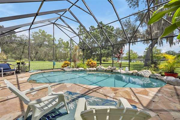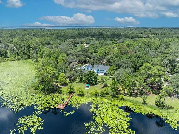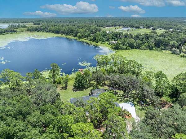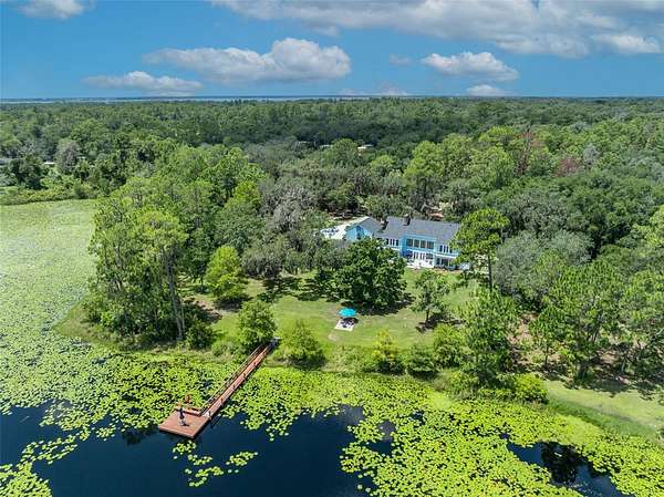 One-of-a-kind lakefront estate with a pool, and private dock on 6.41 acres! This property offers peaceful Florida living at its finest. Surrounded by timeless oaks and overlooking tranquil Jenkins Pond, the property is designed for both relaxation and recreation. From fishing off your dock to enjoying your heated pool or relaxing on the screened lanai, every day feels like a retreat. Inside, you'll find 3,402 square feet of living space with soaring cathedral ceilings, expansive windows, and French doors that fill the home with natural light while showcasing exceptional lake views. The open great room features a wood-burning fireplace and flows seamlessly into the dining room, which sits just off the kitchen. The beautifully updated kitchen offers granite countertops, a new dishwasher, an island, soft-close cabinets, and a breakfast bar. The layout is designed with space for everyone, offering five bedrooms and three bathrooms in total. Two bedrooms are located downstairs and three upstairs. The owner's suite is upstairs and is a private sanctuary with its own fireplace, two balconies, and dual walk-in closets. Upstairs, two of the bedrooms, open through French doors to a balcony overlooking the water, where you can enjoy beautiful morning sunrises! The detached two-car garage has a covered walkway that provides easy access to the kitchen, adding everyday convenience to the homes thoughtful design. Recent updates include a new roof (2022), septic tank and drain field (2022), new pavers, a hot water heater (2025), and so much more! Unbeatable location, just minutes to I-4, shopping, dining, and under 40 minutes to Orlando and the beaches. Showings are by appointment only. Come experience this exceptional estate, you won't want to leave paradise once you see it for yourself!