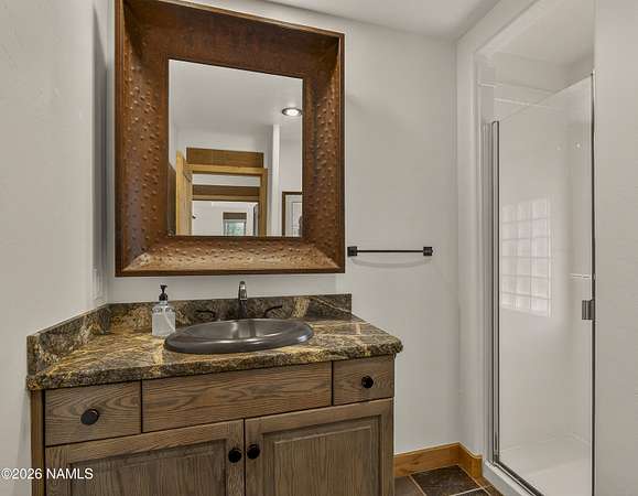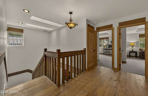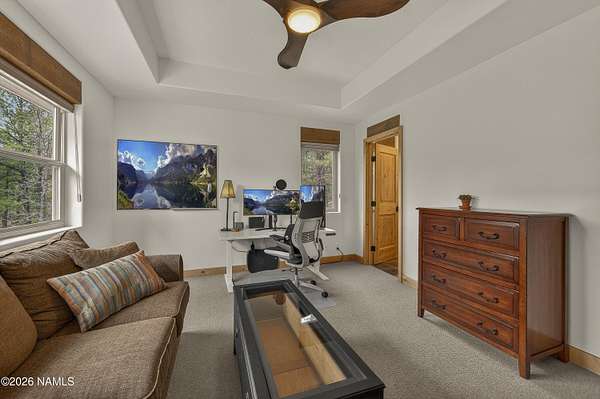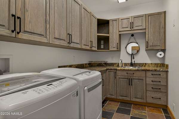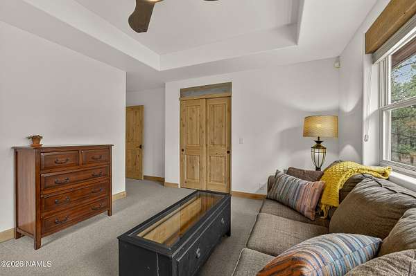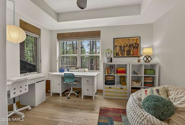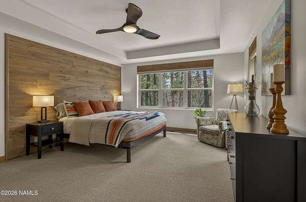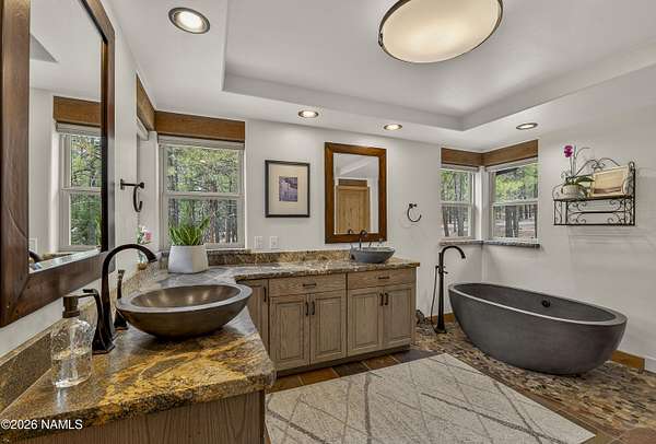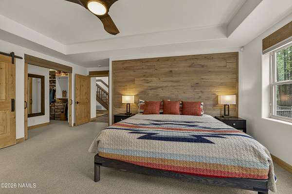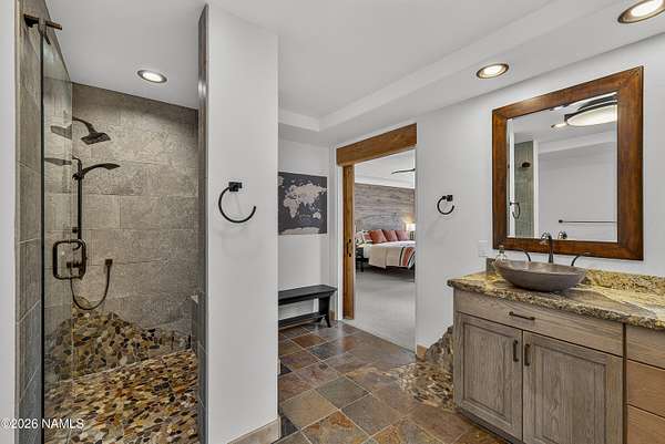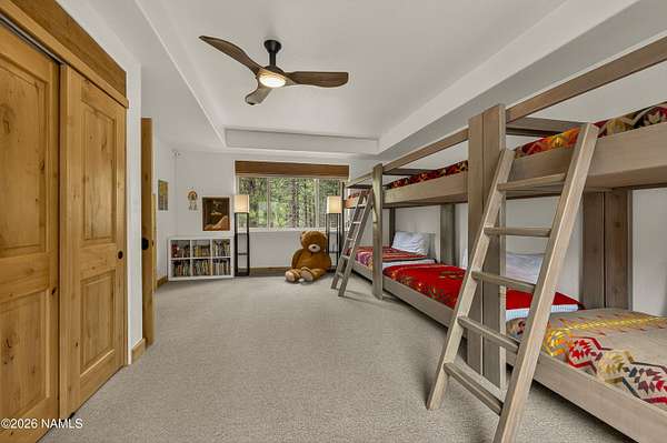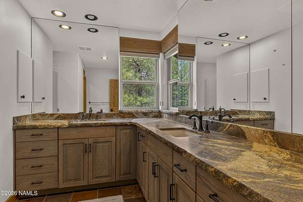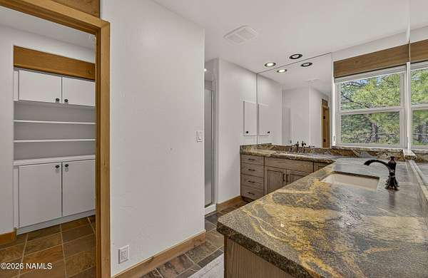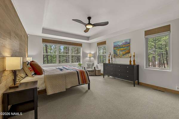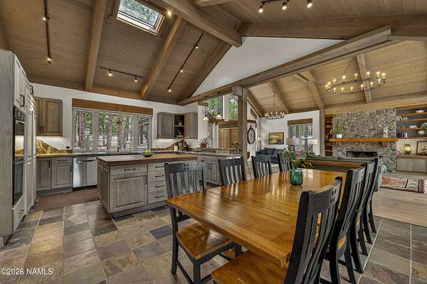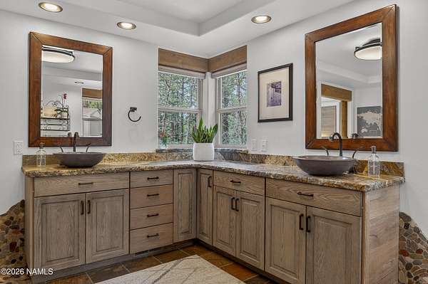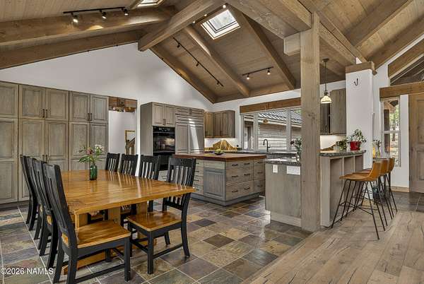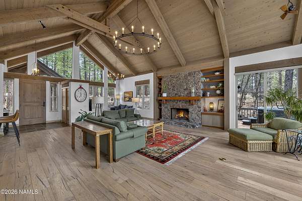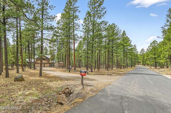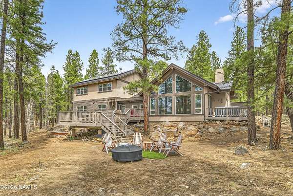 Set on 6.84 Ponderosa pine-covered acres at the base of Mt. Elden, this Legacy property captures the very best of Flagstaff's outdoor lifestyle: privacy, wildlife, and miles of premier mountain biking and hiking right outside your door. A custom home crafted with care and layered improvements welcomes you into a setting that feels both elevated and deeply peaceful. Inside, a grand living room showcases a custom Malapai rock fireplace and expansive view windows framing daily wildlife sightings, offering quiet moments among the pines. The entertainer's kitchen features stain-washed oak cabinetry, a walnut butcher block workstation, double ovens, and a gas cooktop. The main-level primary suite sits near an office or 5th bedroom, with three oversized ensuite bedrooms upstairs, including one with custom triple bunk beds. This home has undergone extensive high-end interior renovations, including Knotty Alder doors and trim, designer lighting, premium wool Berber carpeting, a mix of slate and large plank wood floors, Hunter Douglas window coverings, upgraded stone and granite counters, and a spa-inspired primary bath with a custom slate soaking tub. Recent major investments elevate long-term reliability: owned solar, a premium metal roof, whole-home air sealing by Cozy Home, a high-efficiency heat pump system, and an upgraded 10,000-gallon galvanized cistern. The property has been professionally fire-wise treated, with over 150 additional trees and hazardous limbs removed. A mudroom and laundry area connect to the oversized 3-car garage, and the home includes two heaters, a hot tub, two A/C units, a large shed, a central vacuum, and more. This turnkey mountain retreat blends luxury, durability, privacy, and an unmatched outdoor lifestyle, all on a paved county road in one of Flagstaff's most coveted settings.
