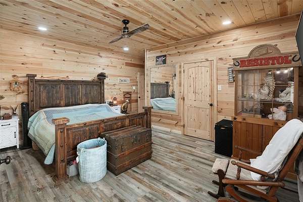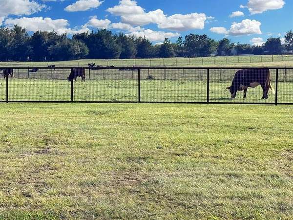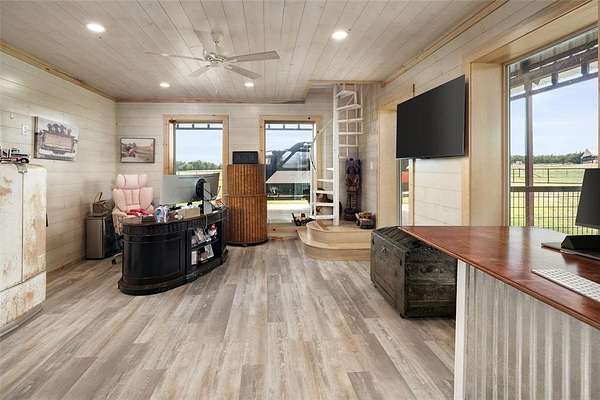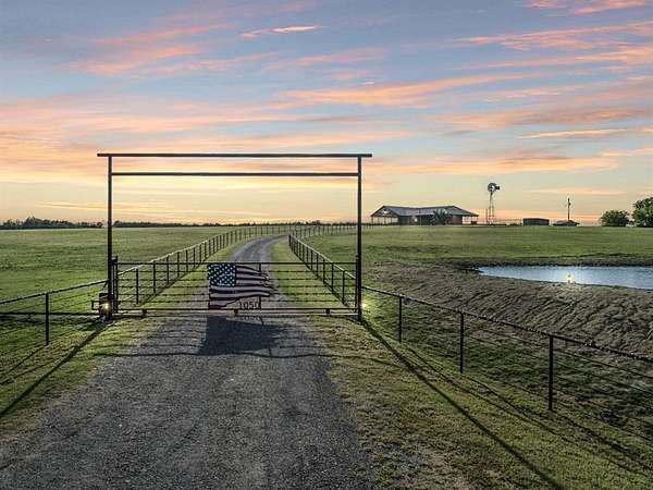 As you pass through the custom gated entrance, the majestic ranch views unfold. Perched on a gentle hilltop, a stunning barndominium stands alongside a classic windmill. The surrounding pastures are alive with the sight of cattle, the views are picturesque. More than a property it's a private retreat where the big sky and quiet landscape create a sense of freedom. Custom double doors with Texas star accents say come on in. The home's soaring ceilings and open floor plan are breathtaking. The living area easily accomodates big sofas, the wood burning stove is a masterpiece. A stunning kitchen with a rugged, chiseled granite island serves as the centerpiece. The faux stone walls add texture, the entire kitchen is a visual delight, stainless appliances are top of the line. The primary suite is a true retreat, with a relaxing en-suite BA. For those working from home or seeking a quiet space for hobbies or home school, the home office provides the perfect, sunlit spot to focus and create. With 4 BR, 2.1 BA, this home is designed for both comfort and convenience. Hickory hardwood floors upstairs, tasteful knotty pine tongue and groove walls, beams, are only a few of the features that add warmth to this wide open space. The over 3,000 sq ft wraparound porch showcases the ranch, enjoy quiet country sunsets or watch the storm roll in. Extended covered parking will accommodate the height of an RV, multiple vehicles. For the discerning rancher, with over 12+ acres of prime agricultural land, fenced and cross-fenced for efficient, safe cattle management. The quality of the high-end fencing speaks to the property's superior standards. A beautiful stock tank with fountain, provides a reliable water source for your herd. Located within competitive Trenton ISD, close to State HWY 121 & 78, shopping and restaurants. Major thoroughfares provide quick and easy access to McKinney, Sherman, Melissa, Anna, Bonham, Greenville.