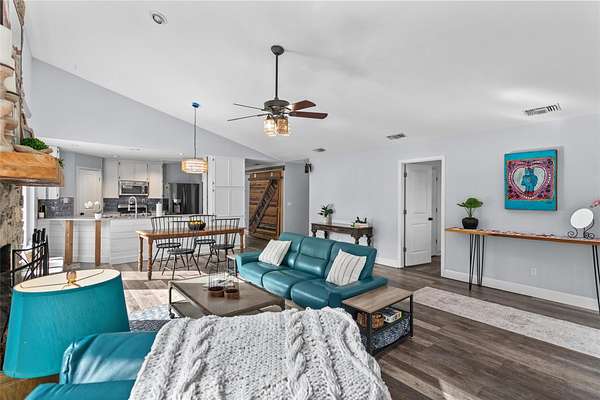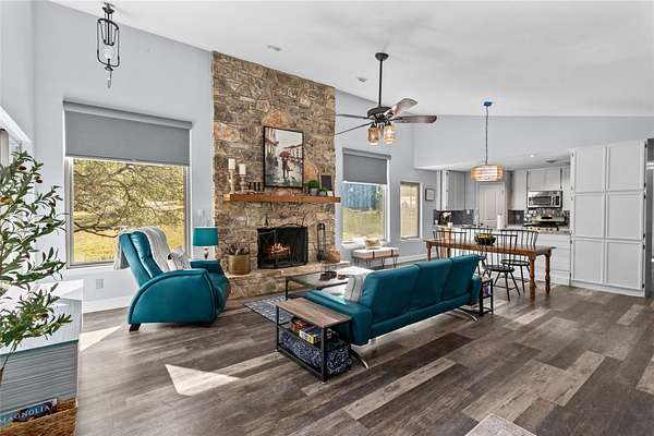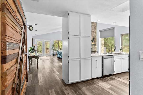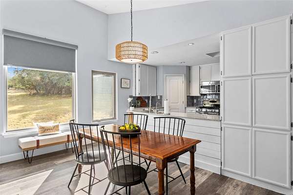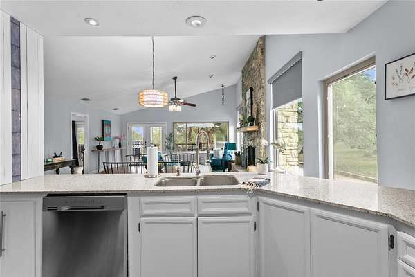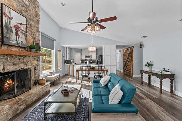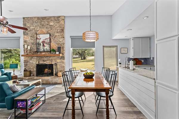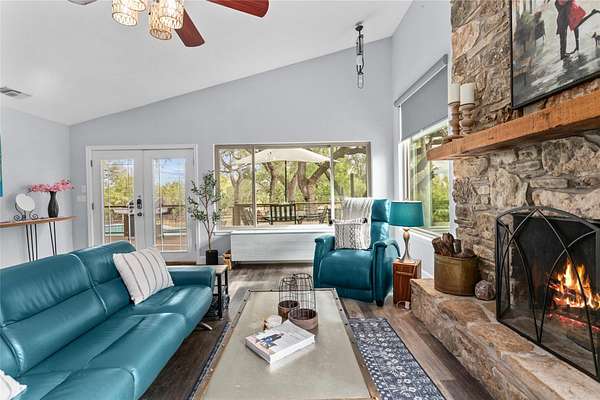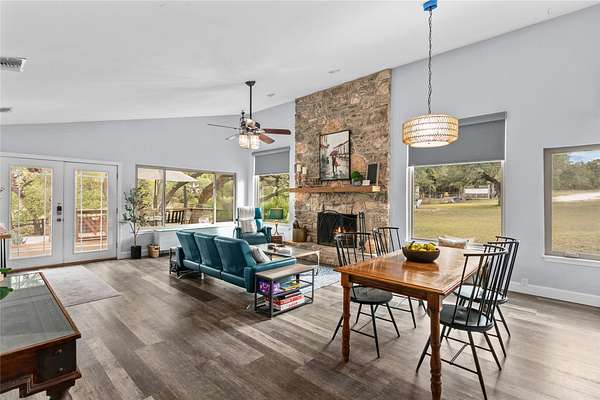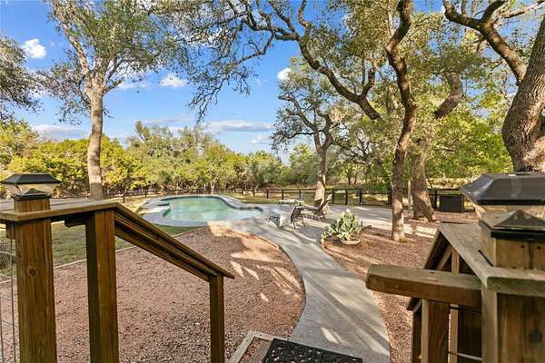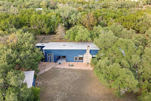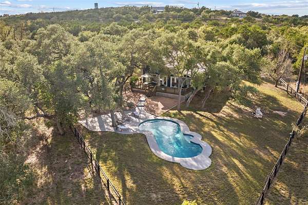Escape to a lifestyle that blends South Austin style with the laid-back charm of Dripping Springs at 1050 Springlake Drive. Set on 4.26 private acres of oak-filled tranquility, this inviting 3-bedroom, 2-bath retreat delivers modern comfort, artistic energy, and room to breathe-just minutes from downtown Dripping Springs. A winding drive leads you through the trees to a home that feels like a hidden getaway. Inside, warm natural light and wood accents create a cozy yet stylish atmosphere. The stone fireplace anchors the open living area, setting the stage for quiet evenings, gatherings with friends, or late-night conversations by the fire. The kitchen blends function and design with sleek quartz counters, modern finishes, and easy flow to the dining and living areas. Step outside and the real magic begins. Start your day with coffee on the spacious deck, surrounded by the sounds of nature. Spend sun-soaked afternoons lounging by the in-ground pool, or entertain under the open Texas sky while watching the sunset paint the landscape in golden hues. Whether you're hosting a weekend BBQ or enjoying a peaceful evening under the stars, this property offers unmatched outdoor living. Ready for hobbies, business needs, or extra storage, the large metal garage/shop is a dream space-ideal for car enthusiasts, creators, collectors, or those who need room to build, craft, or work from home. If you crave privacy but love being close to it all, this home delivers the perfect balance-Austin-inspired energy with Dripping Springs convenience. No HOA, endless potential, and land that feels like your own private park-this is your chance to create a lifestyle you don't need a vacation from. Live free. Live inspired. Live Hill Country. Welcome home