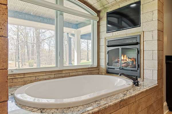 The main-level primary suite offers a private retreat with heated tile floors in the spa-like bath and spacious walk-in closet. Enjoy an oversized double-headed shower, air-jetted soaking tub, and a dedicated fireplace for a warm, relaxing atmosphere. A second fireplace anchors the main living area. Upstairs, two generously sized bedrooms and a full bath provide comfortable accommodations for family or guests. The finished basement adds versatility with a large flex space, private entrance, additional bedroom, and full bath—ideal for guests, in-law quarters, or income-producing potential. Designed for modern living, the home also includes high-speed internet, remote-controlled blinds, and both city and well water to support irrigation and landscaping. Outdoors, enjoy a private resort setting with a heated saltwater pool, outdoor cooking area, basketball pad, and chipping/putting green. The land features three scenic ponds—two stocked—along with open acreage suited for a variety of uses. A detached three-car garage and additional two-car carport provide ample storage, while mature blueberry bushes add charm and function. Whether you’re looking for a private luxury residence, an entertainer’s dream, or a recreational retreat, this property delivers on every level.