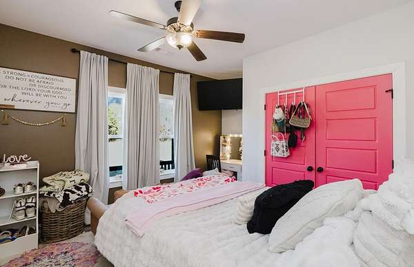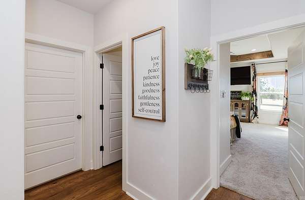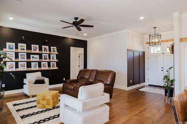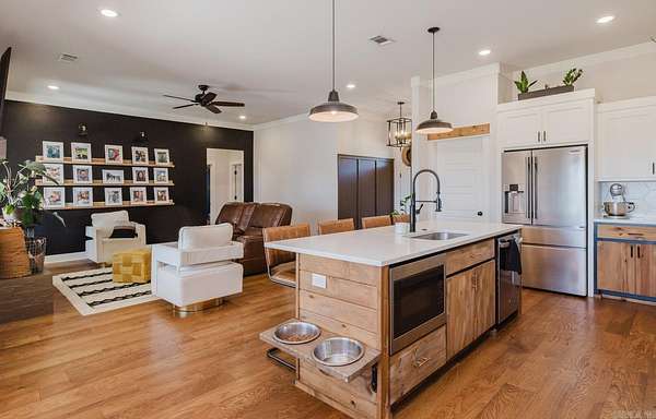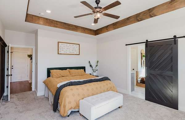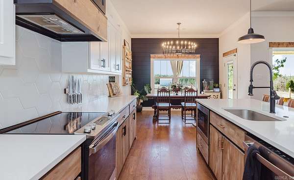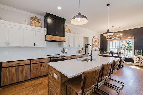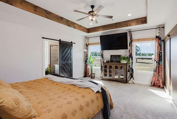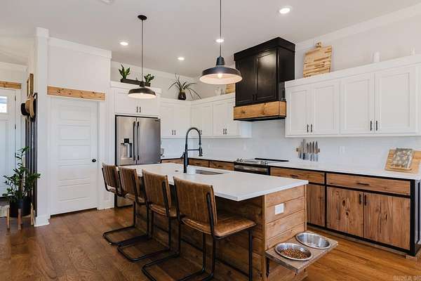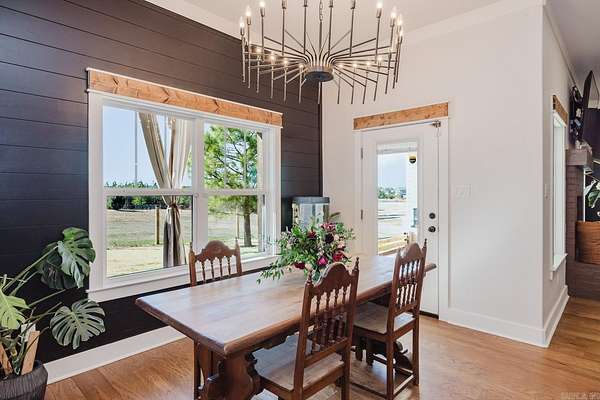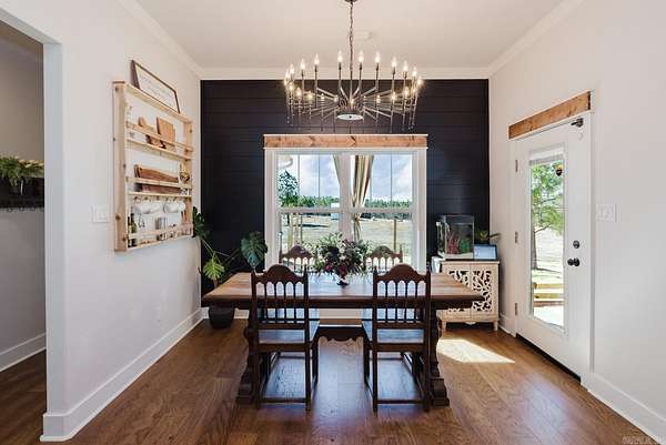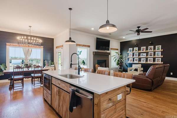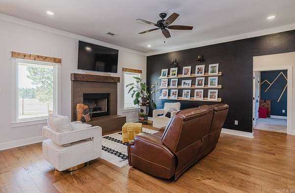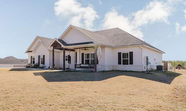 Beautiful custom-built home with an inviting open-concept design and warm living area centered around a wood-burning fireplace. The kitchen is thoughtfully designed with a large island, custom wood finishes, quartz countertops, and an oversized pantry. Perfect for storage and entertaining. The spacious primary suite features charming wood accents, a sliding barn door, walk-in closet, spa-like walk-in shower, double vanities, and a relaxing garden tub. Three additional bedrooms are privately situated away from the primary suite. An oversized laundry room with sink adds everyday convenience, and a tornado shelter is located in the garage for peace of mind. Step outside to enjoy a covered back patio, fenced yard, and a separate 3,000 sq ft fenced homesteading area complete with a storage building and chicken coop. A firepit creates the perfect setting for cozy evenings under the stars. Unwind on the full-size front porch swing and take in the peaceful surroundings. Situated on just under two acres, this property offers comfort, functionality, and plenty of room to spread out and make it your own.