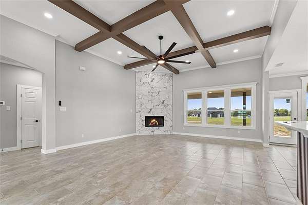The living room boasts dramatic cathedral ceilings, oversized windows, and a cozy wood-burning fireplace, creating a bright and inviting atmosphere. The open-concept design flows into the chef's kitchen, complete with a massive island, custom cabinetry, abundant prep space, and quartz countertops that extend throughout the entire home.