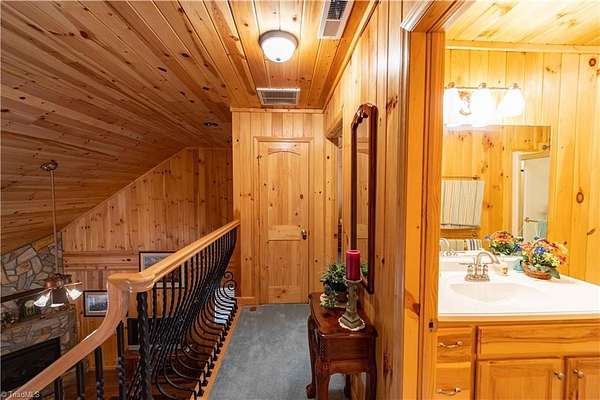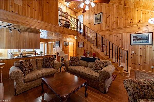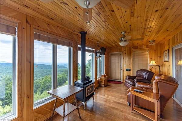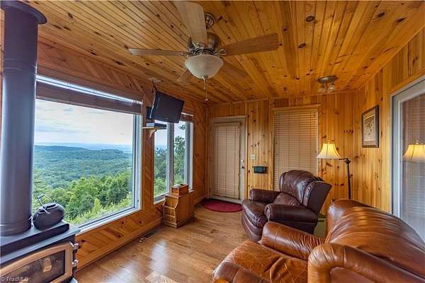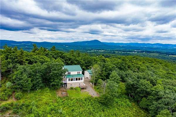Majestic, Long Range Views of the NC Mountains, Va Mountains and the Piedmont of North Carolina! All from this beautiful custom built home at the top of Rich Hill Mountain. This Fully Furnished home is designed to enjoy these views from the Kitchen/Dining area, Den and from all 3 Bedrooms. You enter into a spacious Living Room with a beautiful open staircase and then the open Kitchen and the wall of windows to enjoy the mountains. Primary Suite on Main. 2 bedrooms and full bath upstairs. The woodwork throughout this home is exceptional! Full finished basement has an exterior entrance, full kitchen and bath and could easily be a Mother-In-Law Suite or a Rental. The oversized, detached garage has power, heat, workbenches and shelving for unlimited storage. There is also a second freestanding carport. This is a very special place in the Blue Ridge Mountains!