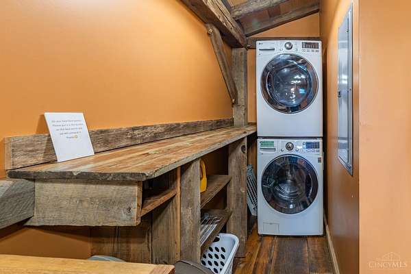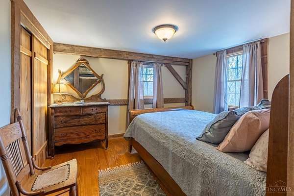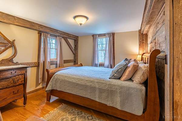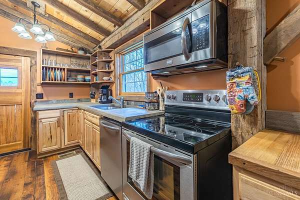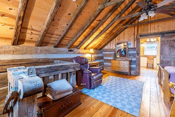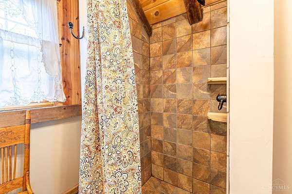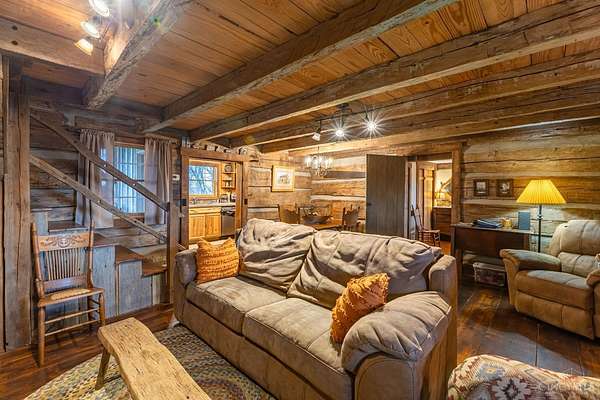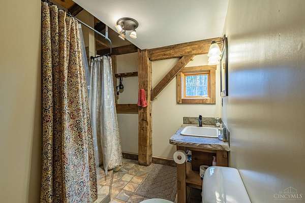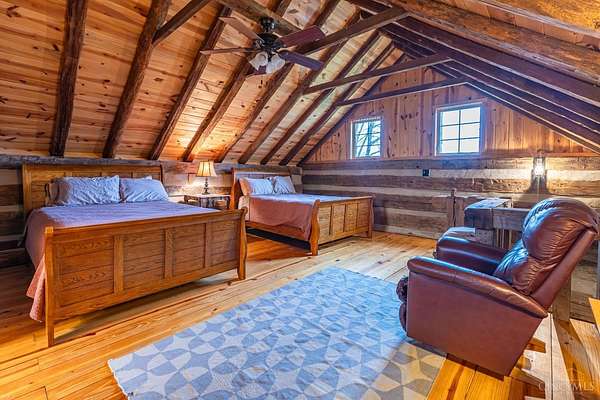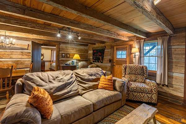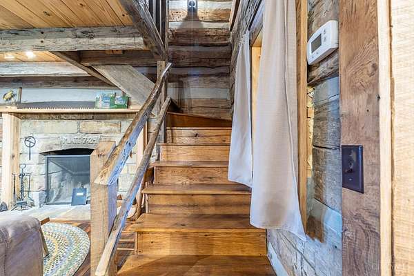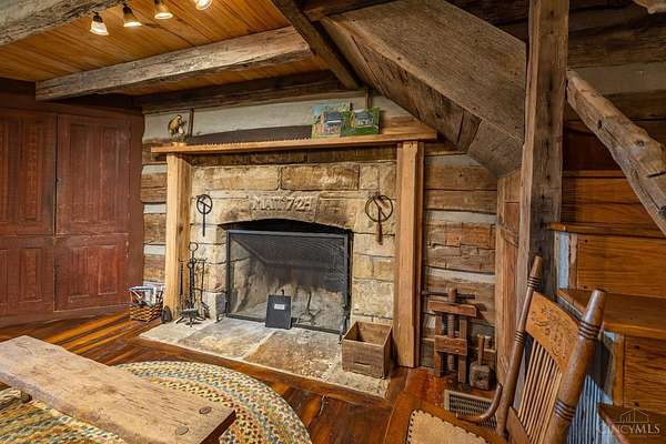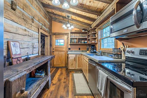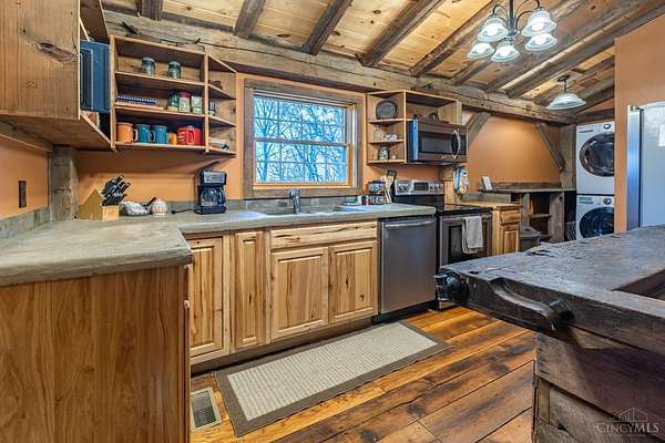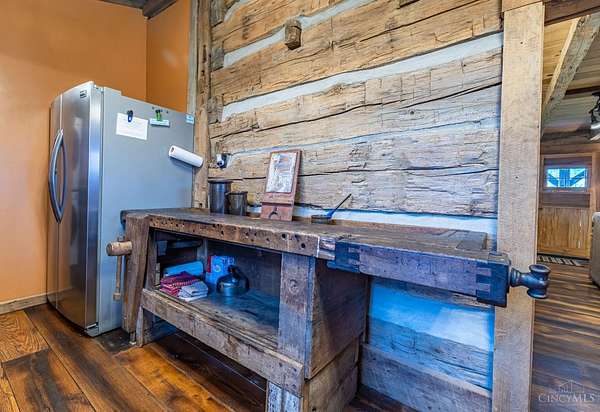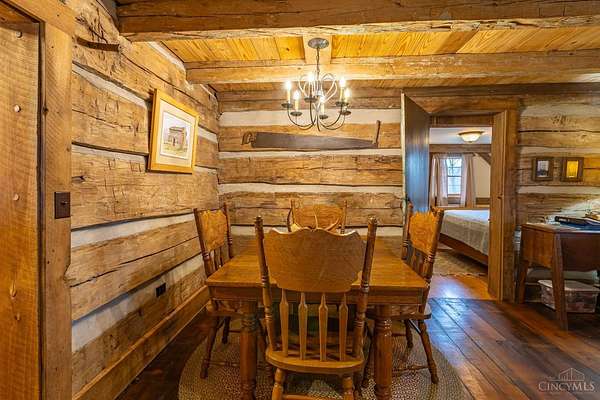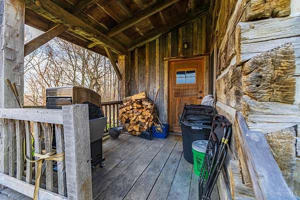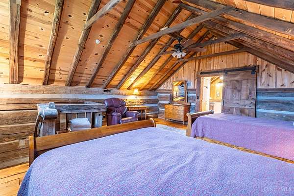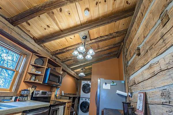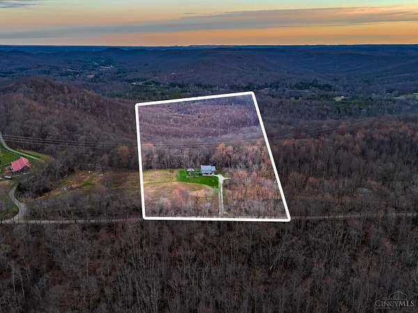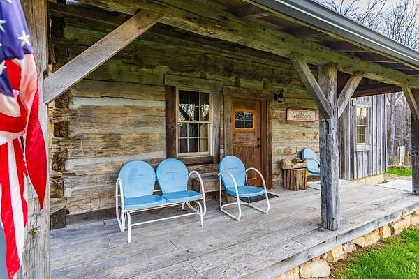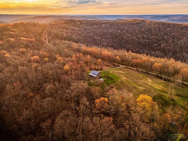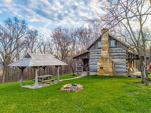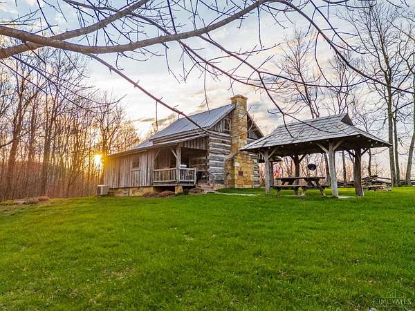 Rustic cabin on approx. 10 acres with scenic views of the rolling foothills of Adams County. This unique property was reconstructed using original stones and hand-hewn logs from historic structures over 100 years old, blending Appalachian character with modern comfort. Home features 2 BR and 2 full baths. The upstairs BR includes wood flooring, walk-in closet, and private bath with tiled shower and floor. Kitchen offers hickory cabinetry, concrete countertops, and appliances. The living room features wood flooring and a striking stone chimney fireplace. Enjoy the peaceful setting from the covered front and back porches overlooking the countryside. Property includes abundant wildlife, fire pit, and timber-framed gazebo with picnic area. Ideal for a private retreat, weekend getaway, Airbnb/short-term rental, hunting cabin, or recreational property. Conveniently located within 30 minutes of Serpent Mound, Edge of Appalachia preserves, Ohio Brush Creek, and numerous hiking trails!