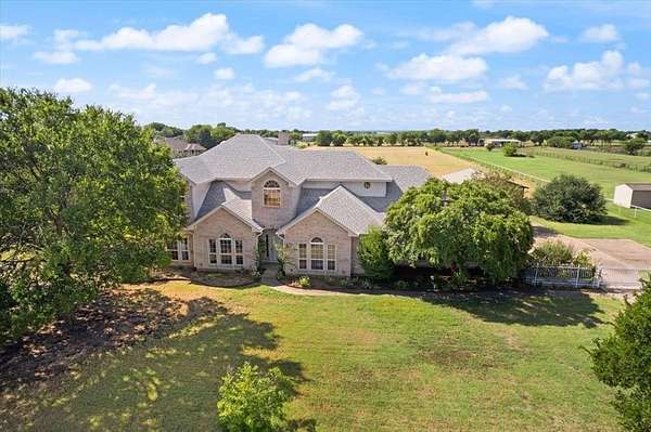 This custom-built, one-owner home sits on five acres of flat pasture with no city taxes, just minutes from the tollway, shopping, and dining. Inside, you'll find spacious rooms with ten-foot ceilings, crown molding, and a wood-burning fireplace. The primary suite features dual walk-in closets, double vanities, a separate shower and tub, and private patio access.
