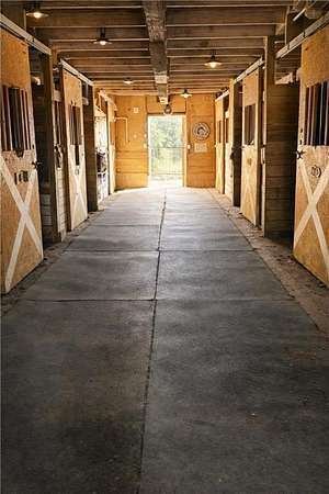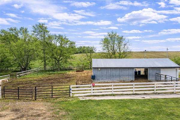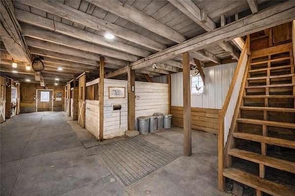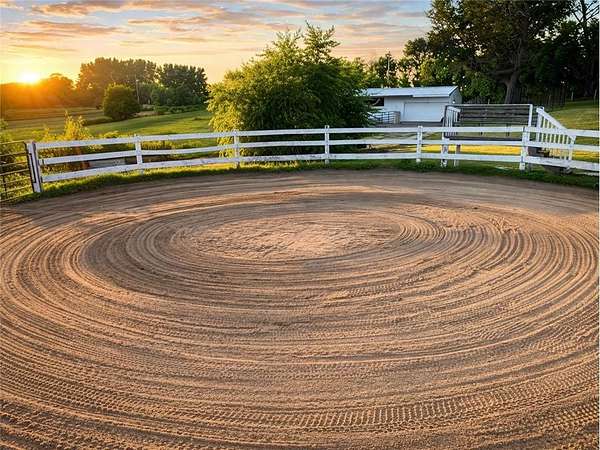 Fully equipped for equestrian use, the property features an outdoor riding arena, round pen, 6-stall barn, 5 paddocks with shelters, and a large grass pasture. The layout supports ease of movement and daily routines, making it ideal for horse care, hobby farming, or simply enjoying open space.