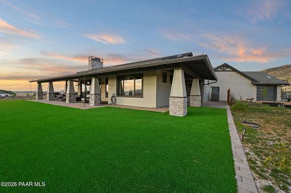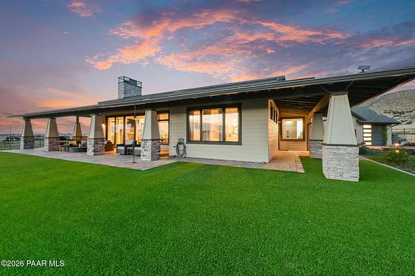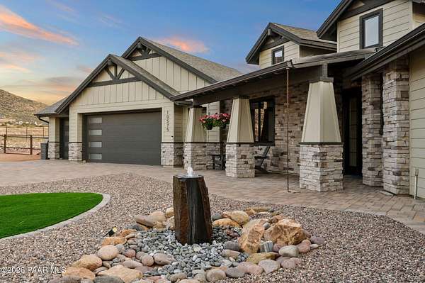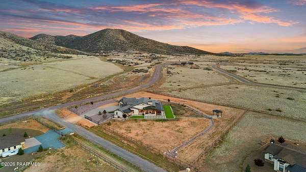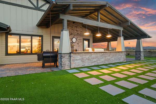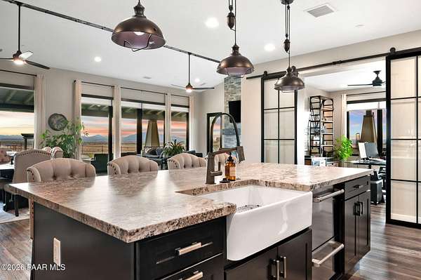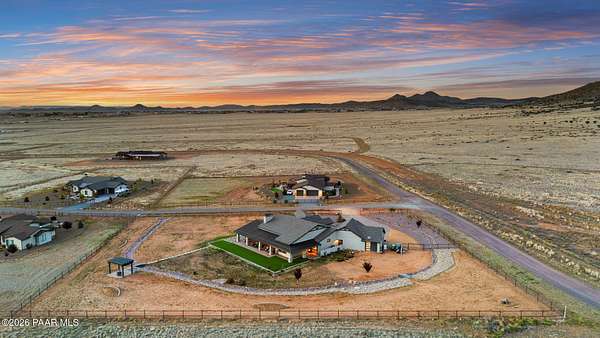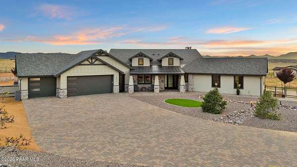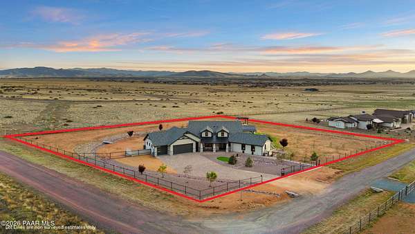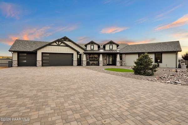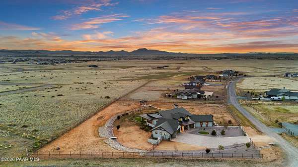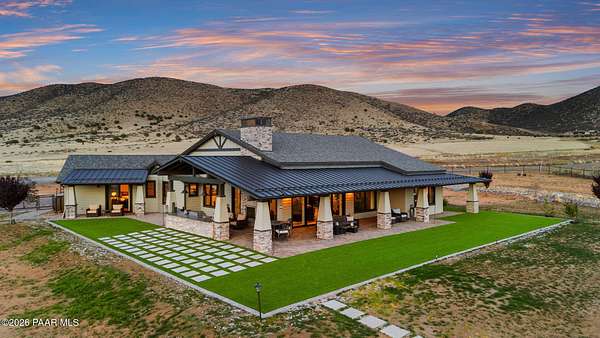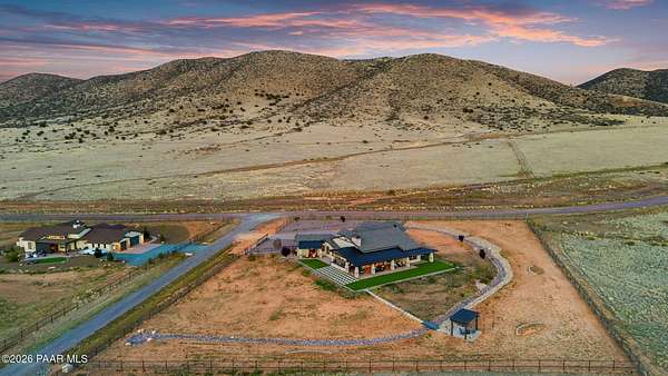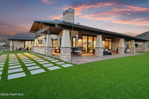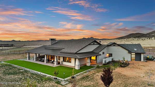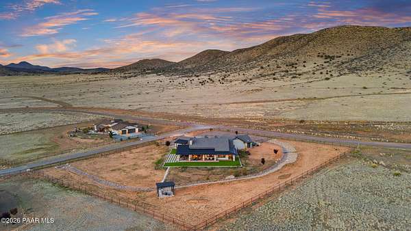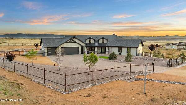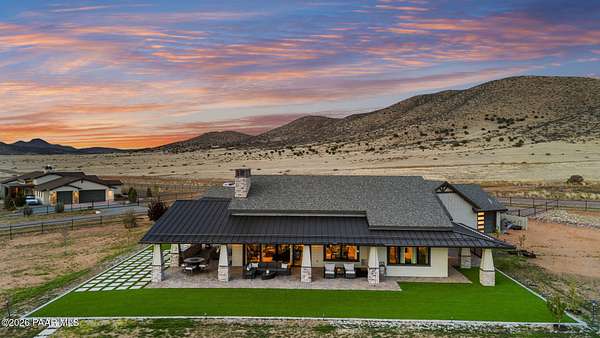 Behold the pinnacle of high-desert living in this 3,178 sq-ft architectural masterpiece, where industrial elegance meets the rugged beauty of Prescott. Perfectly positioned on two meticulously manicured, fully fenced acres, this 3-bedroom plus office, 3.5-bath estate was masterfully designed so that every window frames Prescott's most iconic views. This estate is perfect as a full-time residence or a secure lock-and-leave for those seeking a luxury escape from the Phoenix heat.Enter through private electric gates to a grand arrival featuring RV parking, a bubbling rock fountain, and sophisticated metal roof accents. The home is powered by 400-amp service (RV garage ready) and a 24k generator. The heart of the home is a culinary atelier boasting a massive island topped with exotic leathered Montecristo granite--one of six full slabs used throughout. This gourmet space features Cafe appliances, a Thor beverage fridge, a pot filler, and custom brick backsplashes, flowing into a sophisticated morning kitchen.The split floorplan ensures total seclusion. In the family room, soaring Pella sliding glass doors lead to multiple covered patios and an entertainer's paradise with a dual-sided fireplace and an incredible outdoor kitchen. The primary sanctuary offers a freestanding soaking tub, a rainfall shower, and a private garden terrace with a secluded outdoor shower. Guests enjoy unrivaled privacy in a separate wing with a mini-kitchen bar and dedicated mini-split--ideal for an in-law suite or caregiver quarters. Built with uncompromising integrity, the home features full spray foam insulation, an electric furnace, and an oversized 3-car drive-through garage. Experience unrivaled prestige and comfort. WELCOME HOME!