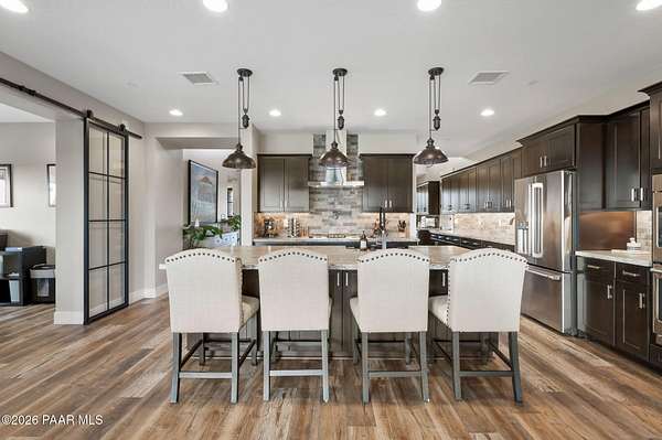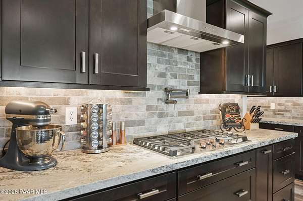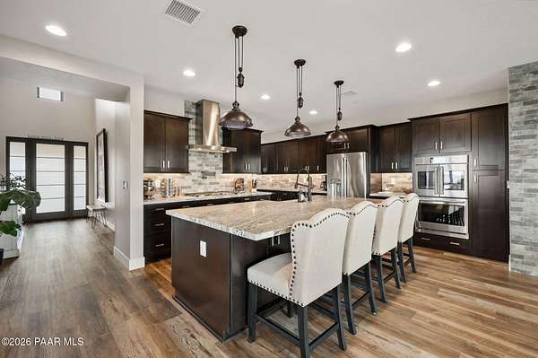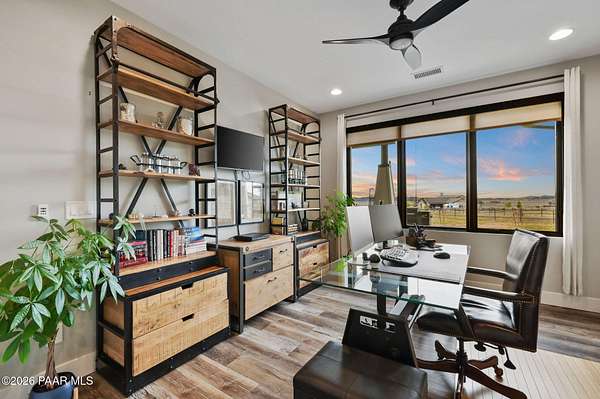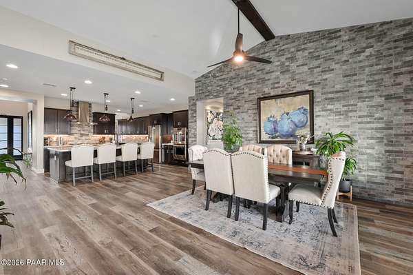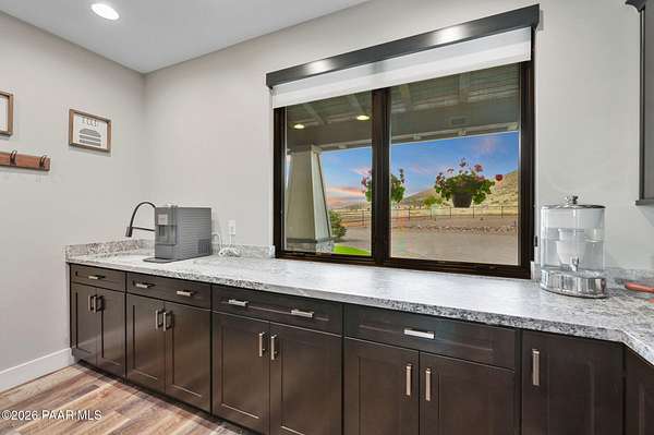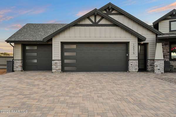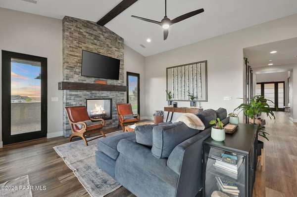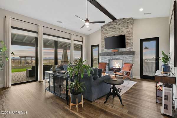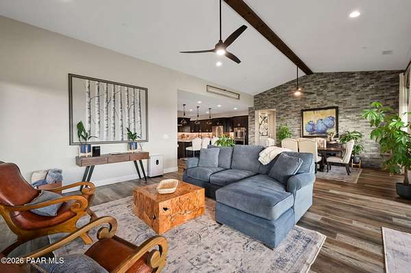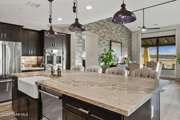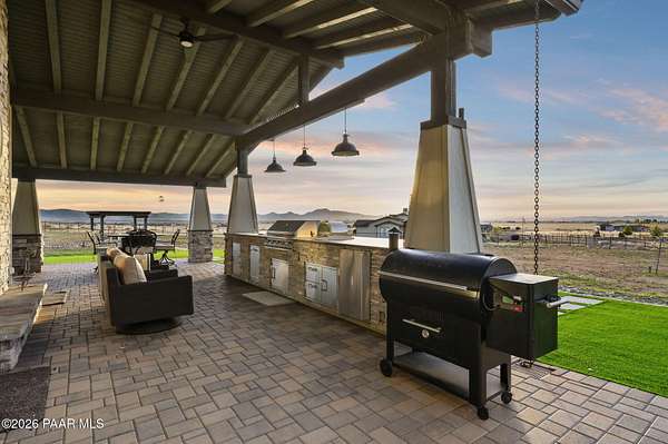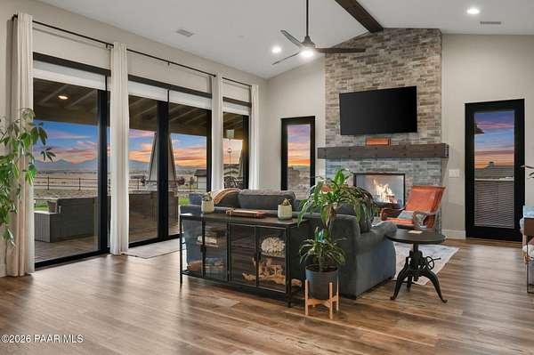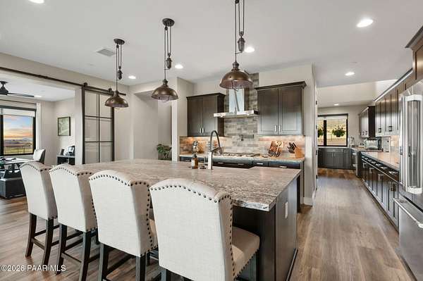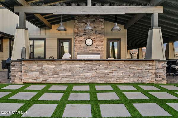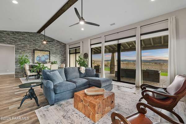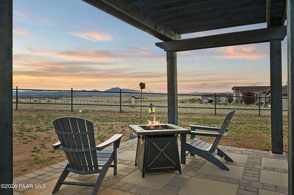 Behold the pinnacle of high-desert living in this 3,178 sq-ft architectural masterpiece, where industrial elegance meets the rugged beauty of Prescott. Perfectly positioned on two meticulously manicured, fully fenced acres, this 3-bedroom plus office, 3.5-bath estate was masterfully designed so that every window frames Prescott's most iconic views. This estate is perfect as a full-time residence or a secure lock-and-leave for those seeking a luxury escape from the Phoenix heat.Enter through private electric gates to a grand arrival featuring RV parking, a bubbling rock fountain, and sophisticated metal roof accents. The home is powered by 400-amp service (RV garage ready) and a 24k generator. The heart of the home is a culinary atelier boasting a massive island topped with exotic leathered Montecristo granite--one of six full slabs used throughout. This gourmet space features Cafe appliances, a Thor beverage fridge, a pot filler, and custom brick backsplashes, flowing into a sophisticated morning kitchen.The split floorplan ensures total seclusion. In the family room, soaring Pella sliding glass doors lead to multiple covered patios and an entertainer's paradise with a dual-sided fireplace and an incredible outdoor kitchen. The primary sanctuary offers a freestanding soaking tub, a rainfall shower, and a private garden terrace with a secluded outdoor shower. Guests enjoy unrivaled privacy in a separate wing with a mini-kitchen bar and dedicated mini-split--ideal for an in-law suite or caregiver quarters. Built with uncompromising integrity, the home features full spray foam insulation, an electric furnace, and an oversized 3-car drive-through garage. Experience unrivaled prestige and comfort. WELCOME HOME!