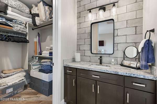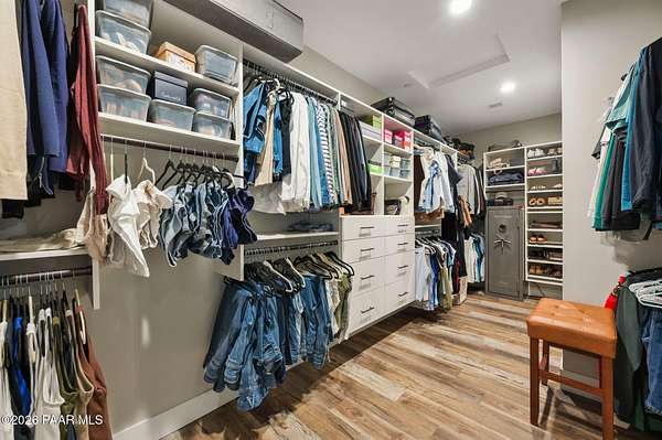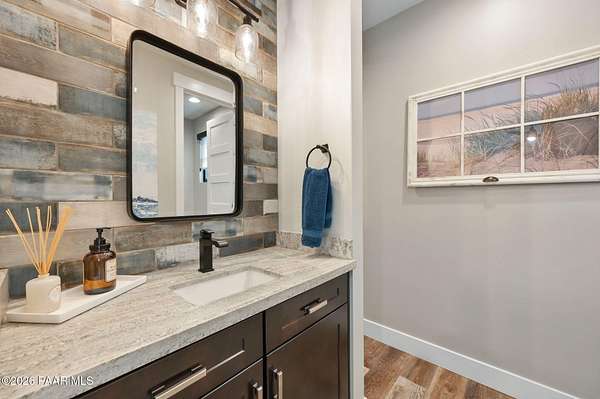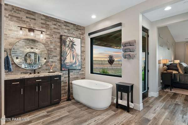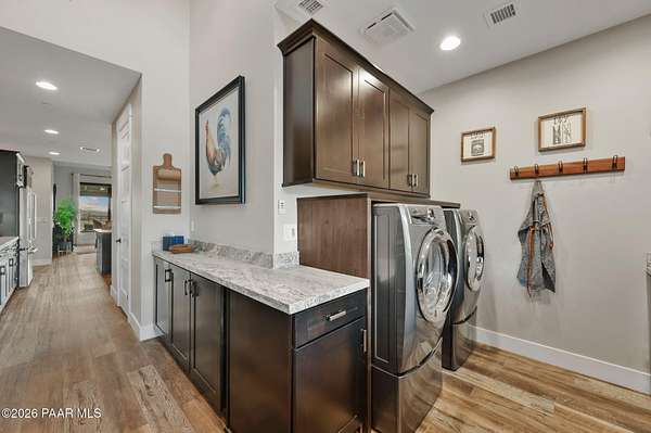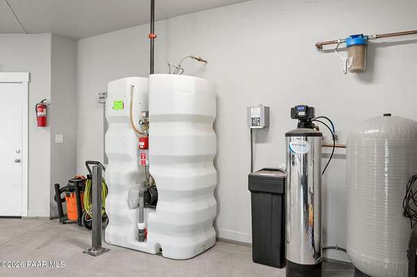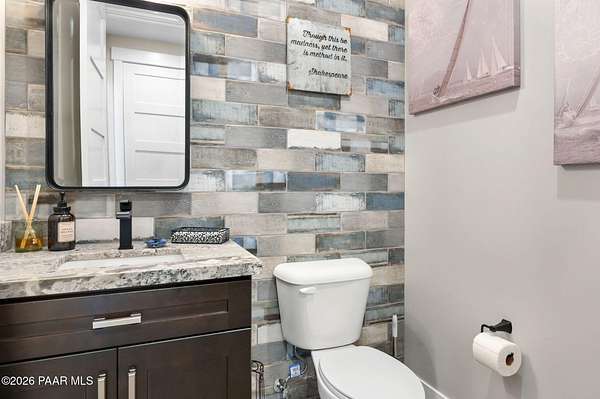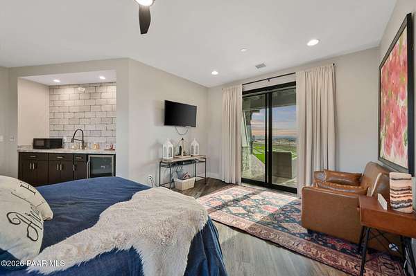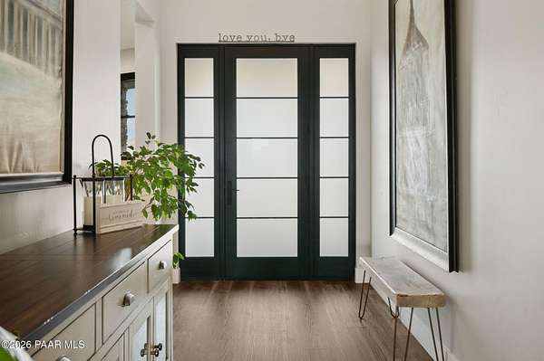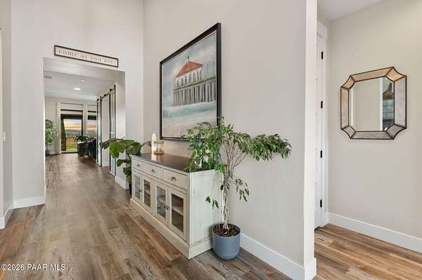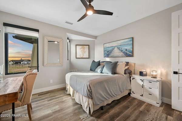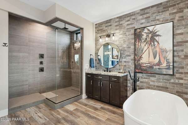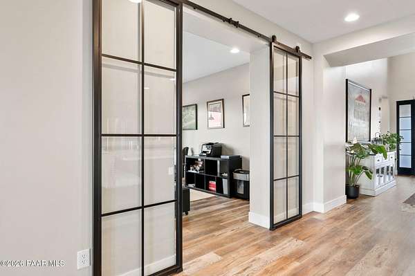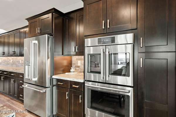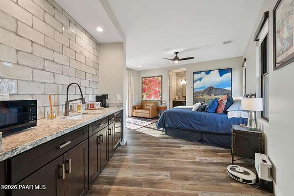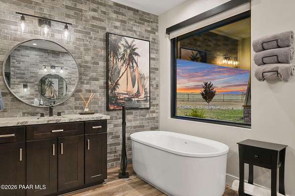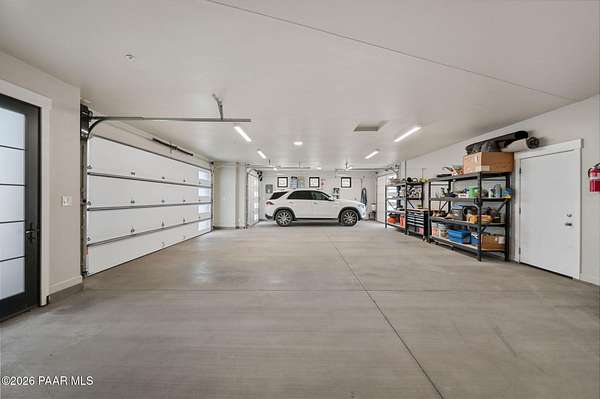 Behold the pinnacle of high-desert living in this 3,178 sq-ft architectural masterpiece, where industrial elegance meets the rugged beauty of Prescott. Perfectly positioned on two meticulously manicured, fully fenced acres, this 3-bedroom plus office, 3.5-bath estate was masterfully designed so that every window frames Prescott's most iconic views. This estate is perfect as a full-time residence or a secure lock-and-leave for those seeking a luxury escape from the Phoenix heat.Enter through private electric gates to a grand arrival featuring RV parking, a bubbling rock fountain, and sophisticated metal roof accents. The home is powered by 400-amp service (RV garage ready) and a 24k generator. The heart of the home is a culinary atelier boasting a massive island topped with exotic leathered Montecristo granite--one of six full slabs used throughout. This gourmet space features Cafe appliances, a Thor beverage fridge, a pot filler, and custom brick backsplashes, flowing into a sophisticated morning kitchen.The split floorplan ensures total seclusion. In the family room, soaring Pella sliding glass doors lead to multiple covered patios and an entertainer's paradise with a dual-sided fireplace and an incredible outdoor kitchen. The primary sanctuary offers a freestanding soaking tub, a rainfall shower, and a private garden terrace with a secluded outdoor shower. Guests enjoy unrivaled privacy in a separate wing with a mini-kitchen bar and dedicated mini-split--ideal for an in-law suite or caregiver quarters. Built with uncompromising integrity, the home features full spray foam insulation, an electric furnace, and an oversized 3-car drive-through garage. Experience unrivaled prestige and comfort. WELCOME HOME!