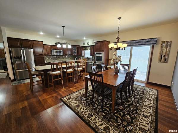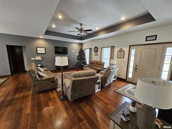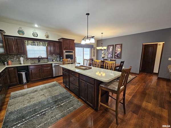 Lovely contemporary ranch home featuring attractive vinyl and stone siding. The great room floor plan offers gleaming laminate wood flooring and an inviting flow throughout. with fireplace. The kitchen is equipped with stainless steel appliances, a large island with quartz countertops, and seating-perfect for gatherings. A formal dining area adjoins the spacious living room, creating an ideal space for entertaining. The master suite includes two generous walk-in closets and a spa-inspired bathroom with a jetted tub, large shower, and double vanities. Two additional bedrooms are located on the opposite side of the home, along with a full bathroom featuring ceramic tile flooring. Additional rooms include an office/den and a roomy laundry room with extra storage. Exterior highlights include a private patio with a decorative privacy wall, a clean 2-car attached garage, and a finished 24x40 detached building with overhead doors and a rear 10x40 lean-to. The property also features an asphalt driveway, 1.58 acres, attractive landscaping, and a covered front porch. Move-in ready and located on the edge of town with a peaceful country setting.