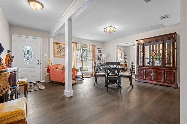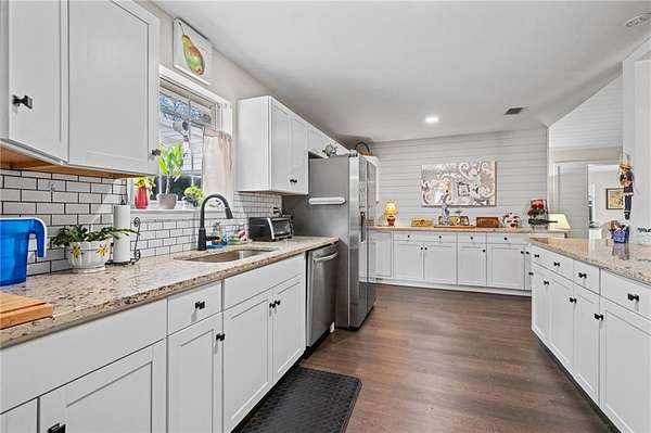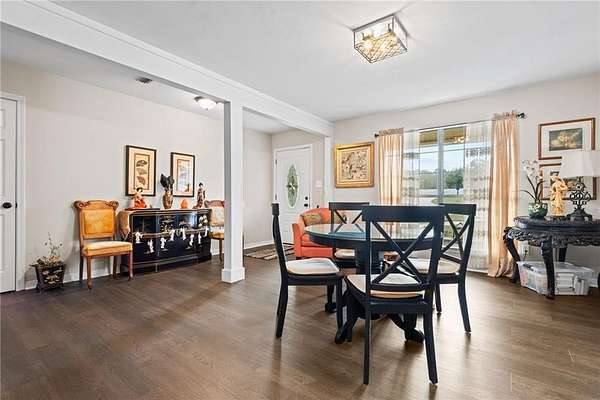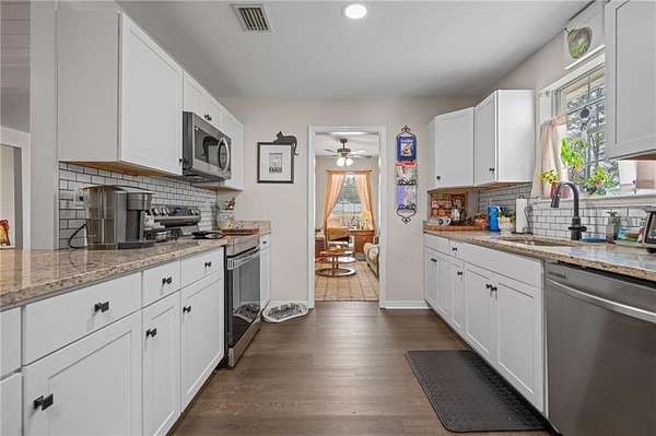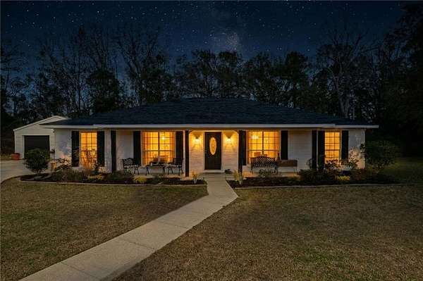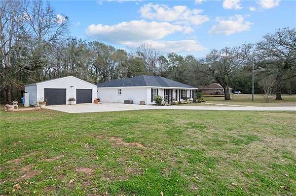 Beautiful home just minutes from the heart of Grand Bay, this 3-bedroom, 2-bath home offers the perfect blend of privacy and convenience. Only minutes from the interstate, you'll enjoy tranquility of country living. Step inside to a spacious open-concept living area with a wood-burning fireplace that provides a cozy space that seamlessly flows into the dining area-ideal for entertaining. The stylish kitchen features custom cabinetry, granite countertops, and stainless steel appliances. Enjoy a generously sized primary suite complete with dual vanities and an oversized walk-in shower. Just off the main living area, a large sunroom fills the home with natural light and provides a relaxing space to unwind. Step outside onto the patio to enjoy peaceful mornings with coffee or a quiet afternoon watching wildlife right in your own backyard. This property also includes a 24x24 2-car detached garage that has been newly wired and offers ample storage. New Roof, LVP flooring, updated kitchen (2022). All kitchen appliances remain. Seller reserves the fridge in the utility room, the electric fireplace in the sunroom is negotiable.