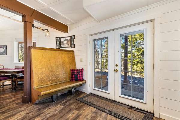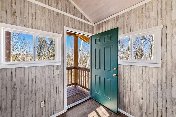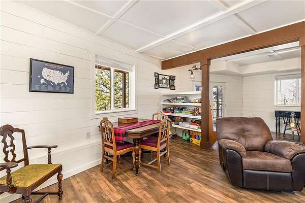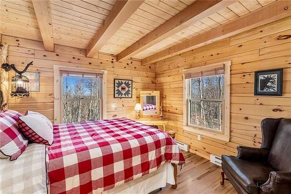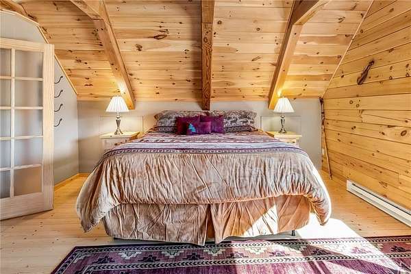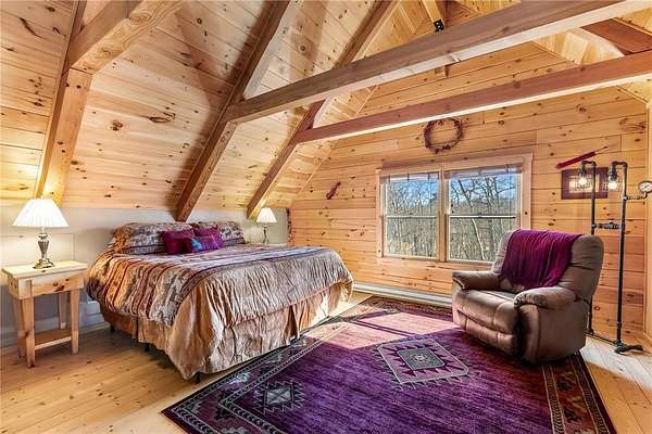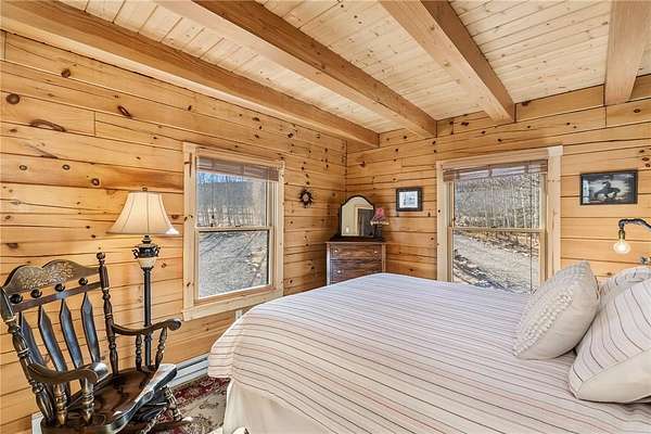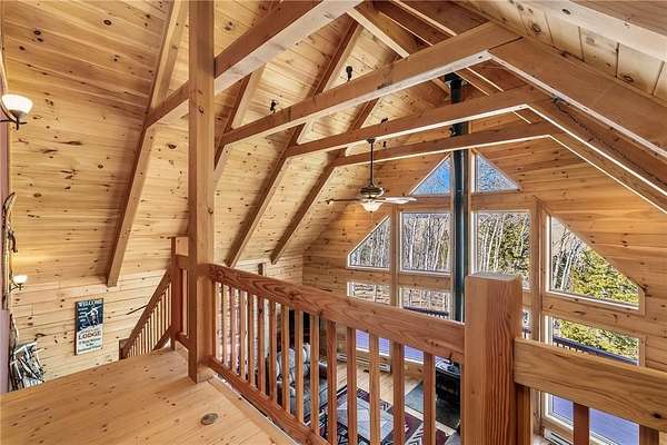 The main level features an open great room with vaulted tongue-and-groove ceilings, exposed beams, and a wood-burning stove. The kitchen offers ample counter space and storage, and opens to a large wraparound deck. Two bedrooms and a full bath are also on this level.