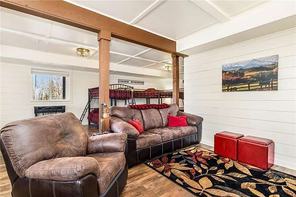 Upstairs, a loft leads to the primary suite with a large closet and five-piece bath. The finished basement adds a second living area and non-conforming bunk space for additional sleeping.