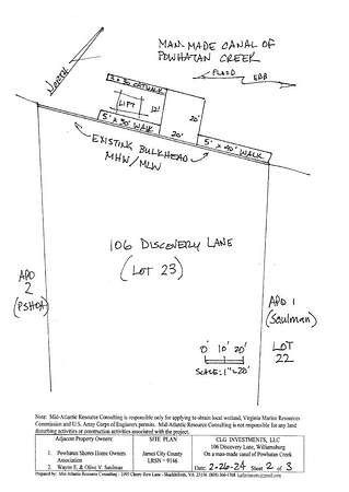 Waterfront! 3-5' MLW Navigable water in James City County Virginia. Excellent location. 5 miles to downtown Williamsburg. Adjacent to the Colonial Parkway. Bike the nearby Capitol Trail! DOCK PERMIT IN HAND! Put the boat in the water and explore the nearby James and Chickahominy Rivers. Stop by James City County Marina for all of your supplies and enjoy the day watching dolphins or amazing James River Sunsets. Take a short boat ride to the vibrant entertainment venue of Billsburg Brewery. Located on a nice .462 acre level Bulk headed canal lot with quick access to the historic and scenic Powhatan Creek near Jamestown Settlement in Powhatan Shores Neighborhood. Optional HOA includes use of common areas and adjacent boat ramp. Lot is in a flood zone but sighted high for ease in flood proof building design. Lot plotted before the mandatory 100' Chesapeake Bay Setback requirements. Public water and sewer. Buy now and build later! Builder has conceptual design ideas.