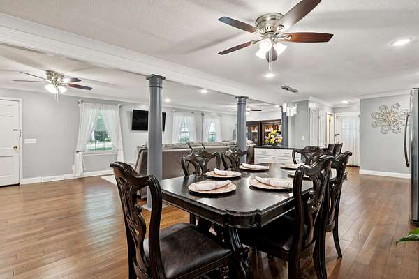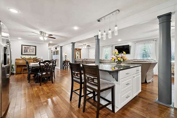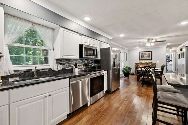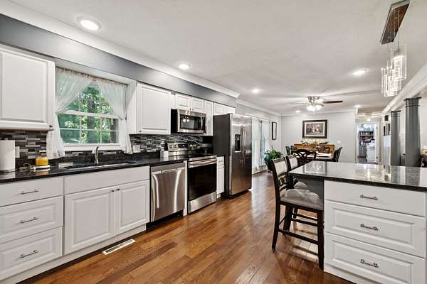 This welcoming home is located within the Rustling Oaks Community and has such delightful curb appeal. Private driveway to the attached two car garage in the back of the home. When you enter through the front door you are greeted by the open floor plan you'll notice the family room is open to the kitchen and dining room space. The kitchen has updated granite countertops and gorgeous hardwood floors throughout main level. Every room is oversized and open allowing extreme versatility based on your lifestyle. Take notice that the furniture is quite large and yet there is still room galore. There is also a large pantry and two additional pantry spaces and large island with a breakfast bar space. From the dining room area you can enjoy your covered patio space that overlooks the serene backyard which has been partially fenced in for kids to play safely or for fur babies to run free, or just simply a feeling of security in your own private yard. On the main floor there are two very large bedrooms both with walk in closets, as well as two bathrooms. Downstairs in the basement is a 3rd bedroom space and half bathroom, currently being used in an open concept manner which is easy to close back. There is also a large family room space with a fireplace. The laundry room is located downstairs as well. This is a home with so much to offer. Schedule your tour today.