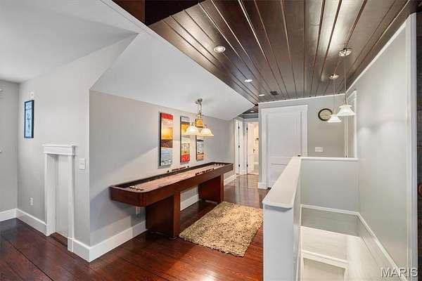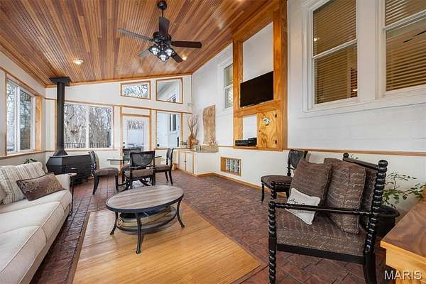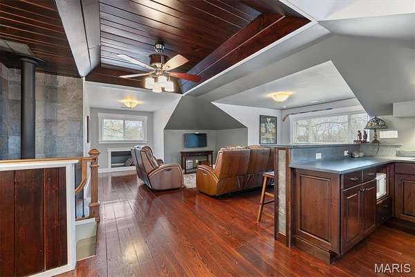 Upstairs, a second living area showcases striking architectural ceiling detail, a Napoleon woodburning freestanding stove, and a well-equipped wet bar with sink, microwave, and refrigerator -- ideal for entertaining or relaxing. Two additional bedrooms and a full bath complete the upper level.