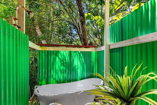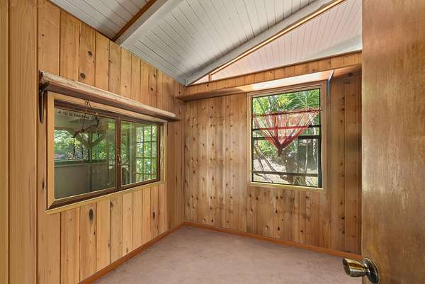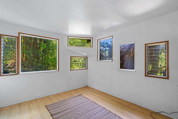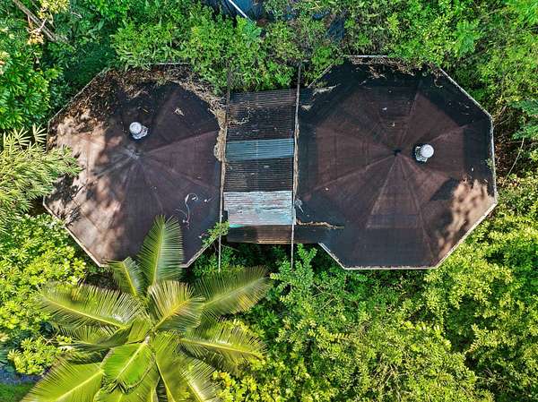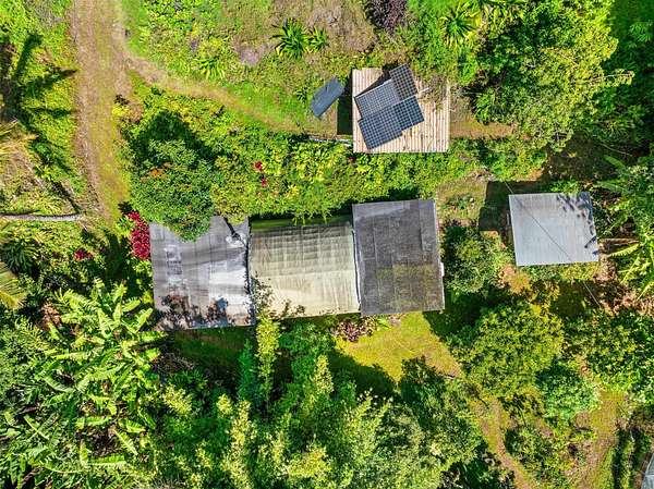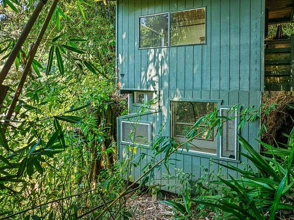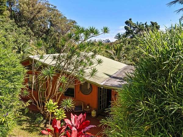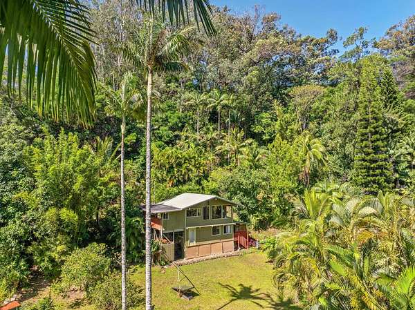 Submerse yourself into nature and drop down (literally) into paradise at this incredible 3-acre property. There is so much more than meets the eye here. Feel the mana as you descend the switchback trail into sacred grounds and find a lovely home, and several other "jungelows" and out buildings. A tropical breeze swirls around in this valley, keeping it cool and climate friendly. You are completely surrounded by greenery and there is a flowing stream that separates the 2 dwellings nicely. There are many fruit trees, beautiful gardens and gorgeous flowers...a truly sustainable property. Slow down and take it all in as you escape to this heaven on earth. Structures have been brought up to county code and are waiting on permits. Access is via a switchback trail. There is no driveway access.