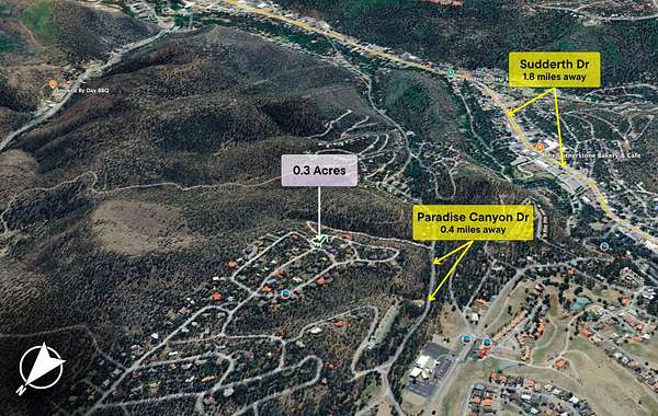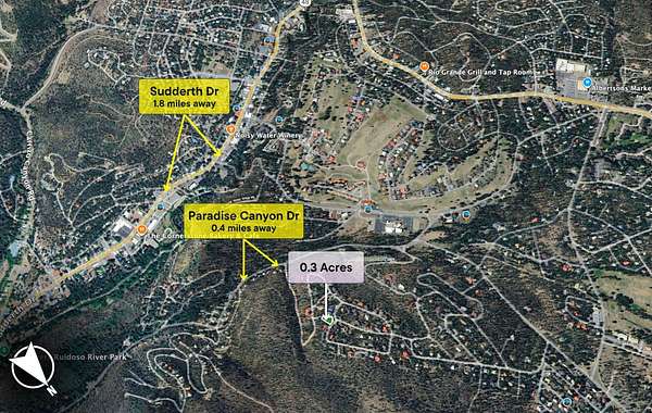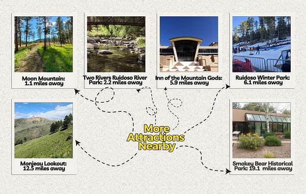 Starting from Ruidoso city hall:Start at 313 Cree Meadows Drive (Village Hall).Head east on Cree Meadows Drive toward Sudderth Drive / NM-48.Turn right onto Sudderth Drive / NM-48 (heading south).Continue on Sudderth Drive / NM-48.Turn left onto Lupine Loop (look for street signs).Follow Lupine Loop until you reach 106 Lupine Loop.
