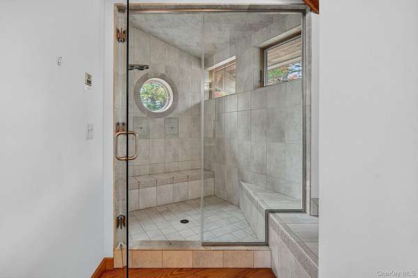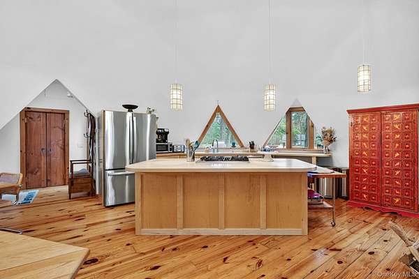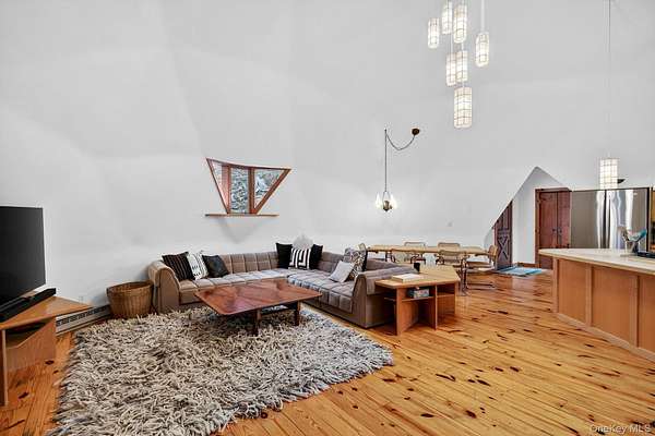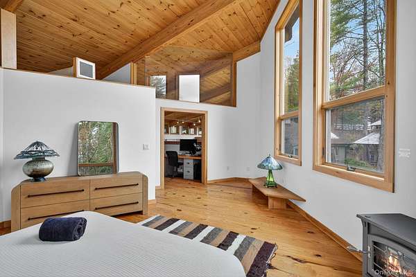 A truly one-of-a-kind residence in the heart of Woodstock, this exceptional home offers luxury, privacy, and architectural distinction on 1.73 secluded acres just minutes from the village. Designed as a fusion of a Frank Lloyd Wright-inspired contemporary addition and an original Buckminster Fuller-style geodesic dome, the property delivers over 3,300 sq. ft. of light-filled living space with remarkable character. Open hardwood floors, soaring Douglas fir ceilings, and walls of glass create an effortless indoor-outdoor flow. The main living area features expansive wall of windows overlooking the natural landscape. A lofted gallery office leads to the primary suite with private gas stove, steam shower, dual vanities, and generous walk-in closet. Two additional guest suites on the lower level each offer private baths and direct access to the outdoor space & stone patio. The original dome includes a separate entrance, full bath, modern kitchen, and wood-burning stove-ideal for studio, guest space, or additional living area. A Central Park-style gazebo and mature grounds complete this serene setting. Located within walking distance to Woodstock's renowned dining, galleries, and music venues while maintaining exceptional privacy. Furnished option available - please inquire with listing agent for details.