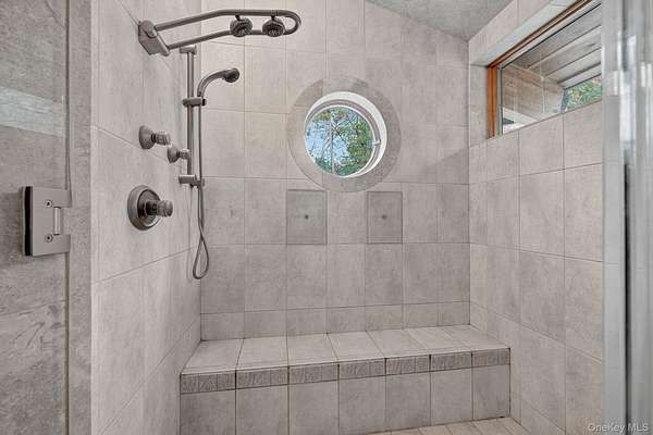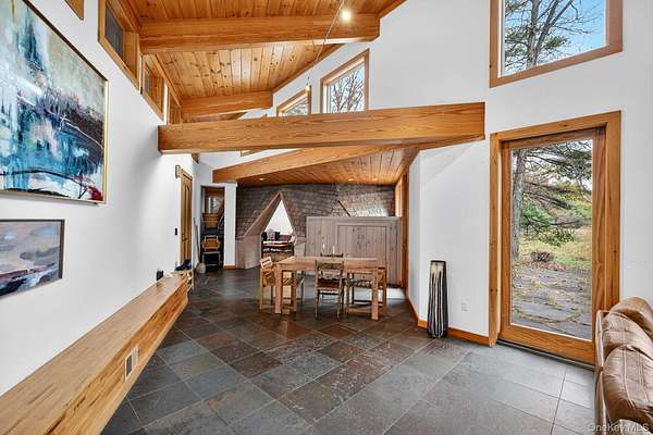 A truly one-of-a-kind residence and rare opportunity, this exceptional home offers a seamless blend of architecture and art in the heart of Woodstock, walking distance to Tinker Street, yet set privately on 1.73 secluded acres just minutes from the village. Designed as a fusion of a Frank Lloyd Wright-inspired contemporary addition and an original Buckminster Fuller-style geodesic dome, the property delivers over 3,300 sq. ft. of light-filled living space with remarkable character and a spacious, flexible layout ideal for both everyday living, work-from-home, and the Hudson Valley lifestyle. Open hardwood floors, soaring Douglas fir ceilings, and walls of windows create an effortless indoor-outdoor flow overlooking the natural landscape. A lofted gallery office leads to the primary suite with private gas stove, steam shower, dual vanities, and a generous walk-in closet. With three well-appointed bedroom suites in the downstairs wing, including two additional guest suites on the lower level, the home offers privacy and comfort for residents and guests alike. Each lower-level suite features a private bath and direct access to the outdoor space and stone patio. The original dome includes a separate entrance, full bath, modern kitchen, and wood-burning stove, ideal for a studio, guest space, or additional living area. A Central Park-style gazebo and mature grounds complete this serene setting. Embrace the luxury of living within walking distance to Woodstock's renowned dining, galleries, and music venues while maintaining exceptional privacy. A rare offering. Furnished option available.