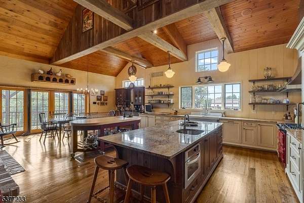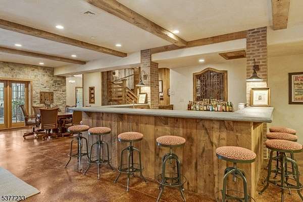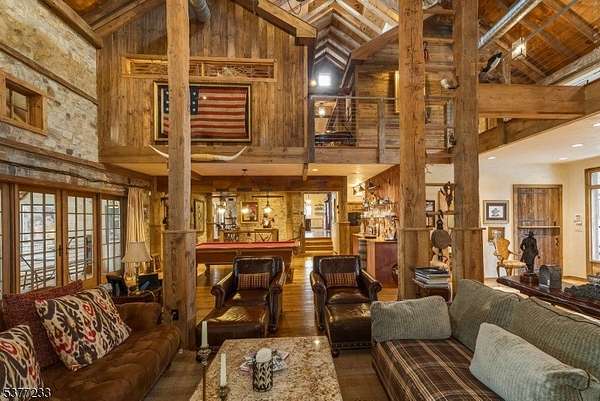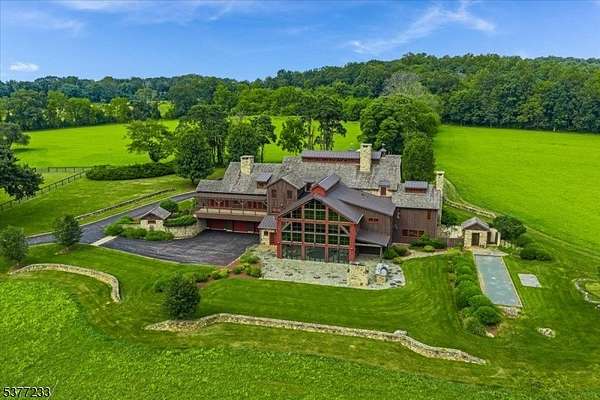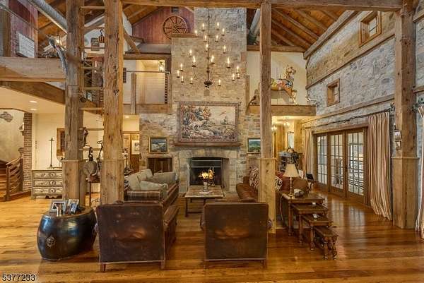 Discover an unparalleled blend of historic grandeur and modern luxury at Double G Farm, a 62+ acre estate rooted in 1850 history. The centerpiece is a museum-quality 1800s barn forming the great room, original beams & panels extend three stories high with a masterful expansion of over 13,000 sq ft that mimics the original stone bank barn's architecture. Exquisite craftsmanship, authentic wood beams, stone accents, cupola ceiling, & steel railings create a unique aesthetic. Sun-filled spaces, select wood flooring, volume ceilings, creative window placements, Venetian walls show impeccable attention to detail. Intelligently designed main level boasts a flawless flow between rooms and features a convenient 1st-floor master suite. 35'+ silo housing custom staircase, leading to BRs, lofted library, & balcony. The lower level is a haven for entertainment and relaxation, enjoy a spacious family room, an 11-stool bar, indoor saltwater pool with Nano doors opening to outdoor kitchen, chef's kitchen, wine cellar, dog grooming room, game room, and 3-car garage. Every detail accounted for w/ amenities including Control 4 Smart Home automation, elevator, dumbwaiters, security cameras, generators, bocce court, & wide radius driveways. Outbuildings: detached 12+-car garage, 4BR guest house, climate controlled EVENT BARN, a 4-stall barn, 2 other full barns, smokehouses & storage sheds. A truly unique opportunity to own a piece of history enhanced with every modern luxury imaginable.