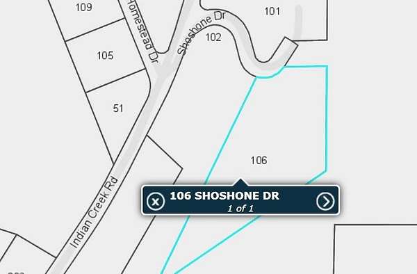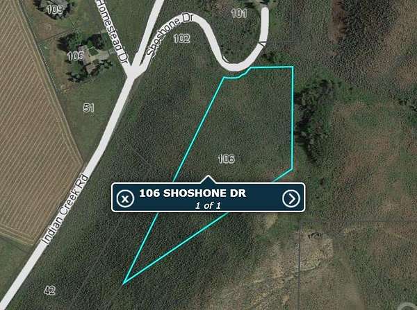 Shoshone is the first street on your right upon entering Indian Creek. Go past the first house on right to the bend in the road. Property is on your right. See old fence line and real estate sign.