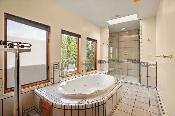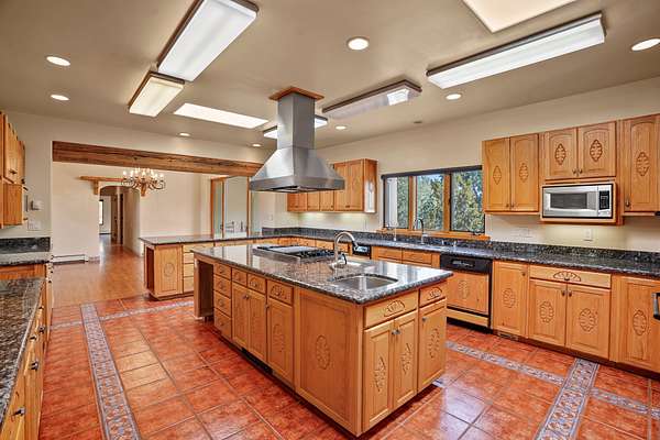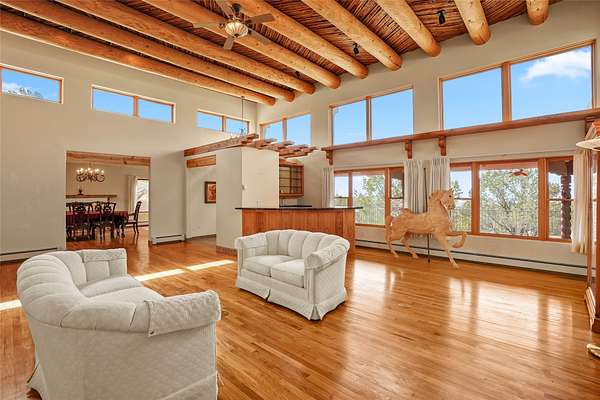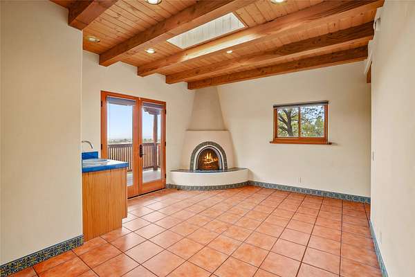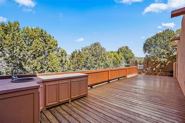 A very special estate offering approximately 1.5 miles to the Historic Santa Fe Plaza. Convenient to Highway 285, Tesuque Village, Ski Santa Fe and The Santa Fe Opera. The single level main house commands exquisite views of Downtown Santa Fe, the Jemez Mountains and a gorgeous, nestled view of the Sangre de Cristo Mountains. The gorgeous Kitchen is well designed and equipped. The guest casita has two fireplaces and also has a great view to Downtown from the large south facing veranda. The beautiful art studio is a perfect workspace with a kitchenette (partial kitchen: Sink, counter, cabinets. No appliances) and 1/2 bath. A 3- car garage is a great addition to this estate compound. There is also a tennis court included with this offering. The tennis court needs work, though it is thoughtfully located on the property with views of Downtown. The Great Room has 14' high ceilings with hand carved beams. The ceiling also has viga and cedar latillas. A wet bar is also located in the Great Room. This is an extremely well-designed home as well as are the additional structures. This property is coyote fenced and gated with many security features.