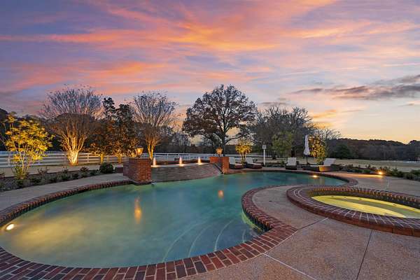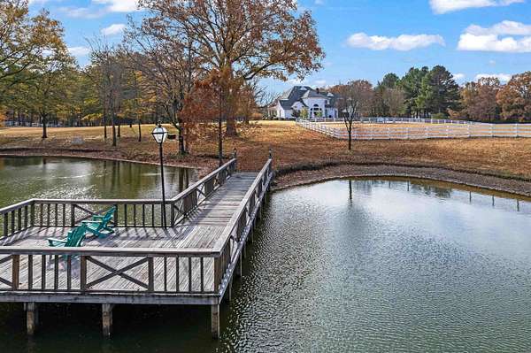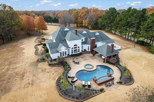 Where Southern Sophistication meets timeless luxury on eleven serene acres in Eads. A gated entrance and tree-lined drive welcome you to peaceful living, complete with a spacious front porch overlooking the property. Enjoy quiet moments by the pool and spa, relax in the hammock by the lake, or gather around the wood-burning fireplace in the covered outdoor kitchen. Inside, a graceful spiral staircase opens to a light-filled living room with expansive views of the backyard. The gourmet kitchen features a 6-burner Wolf range, two Asko dishwashers, Miele microwave/convection oven, built-in Miele coffee maker, Sub-Zero refrigerator and freezer and temp controlled wine cellar. Bourbon Lounge with wet bar, ice maker & fridge. The outdoor kitchen offers an Alfresco Grill, wok, and refrigerator—perfect for entertaining. Custom drapes, designer wallpaper, and luxury finishes add a curated elegance throughout. This estate blends privacy, beauty, and refined Southern charm just outside the city.