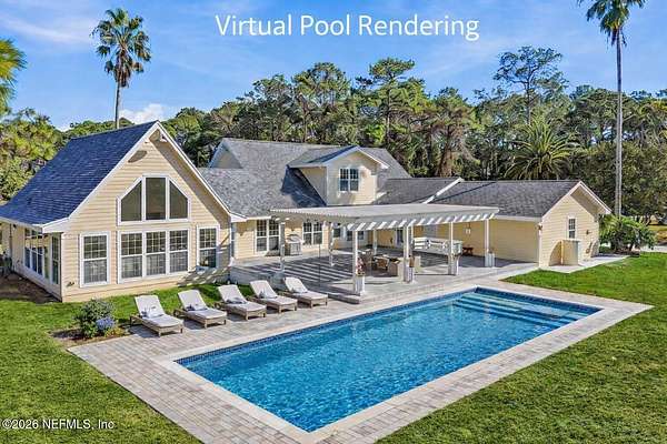 WELCOME to this AMAZING home on over THREE ACRES in Ponte Vedra. This is a rare opportunity to buy an estate home in Quail Ridge Farms, conveniently located in Northern St Johns County with easy access to both Jacksonville & Saint Augustine. Set on a private 3.06-acre homesite with a pond, this beautifully updated 4-bedroom, 3.5-bath residence offers space, style, & peace of mind with extensive recent improvements. In addition to four bedrooms, the home features a dedicated office, ideal for working from home or creating a quiet retreat. A new circular driveway welcomes you home, while Hardie siding (2024), new windows (2024), and a 2015 roof provide lasting curb appeal. Inside, enjoy a thoughtfully expanded sunroom area with a 2023 addition, updated kitchen complemented by marble countertops & abundant natural light. The home features a smart layout with upstairs HVAC replaced in 2021 and downstairs HVAC in 2024, new hot water heaters (2024), new septic tank (2024), and an insulated attic for energy efficiency. Step outside to a pergola with footers, ready for screening if desired, creating the perfect outdoor retreat. This property offers modern updates, flexible living, and acreage privacy. Opportunities like this in Quail Ridge Farms are rare. Ideally located right outside of Nocatee where you can obtain a yearly membership for a nominal fee to all Nocatee Parks (water slides, ziplining, gym, sports courts and fields. Schedule your private showing today and experience firsthand what makes this home and community so special. Pool is a conceptual rendering shown for illustrative purposes only and is not included with the property.