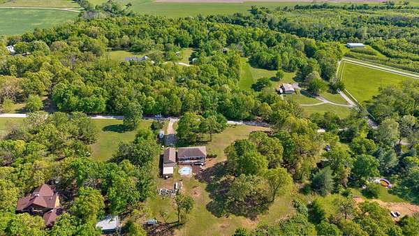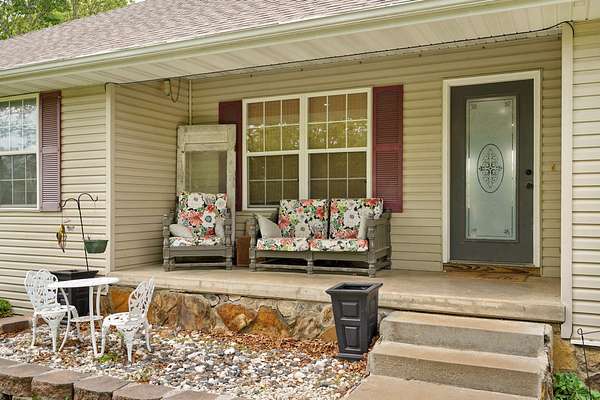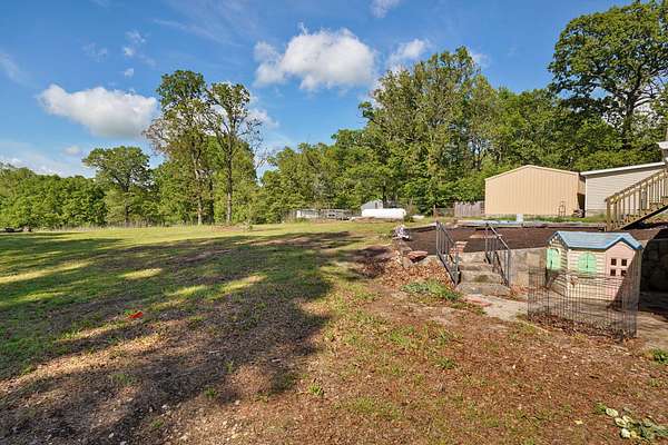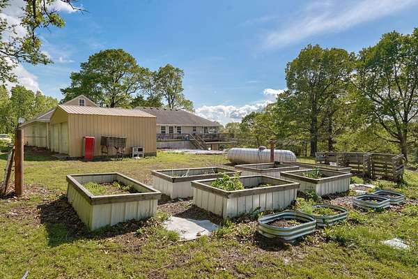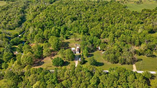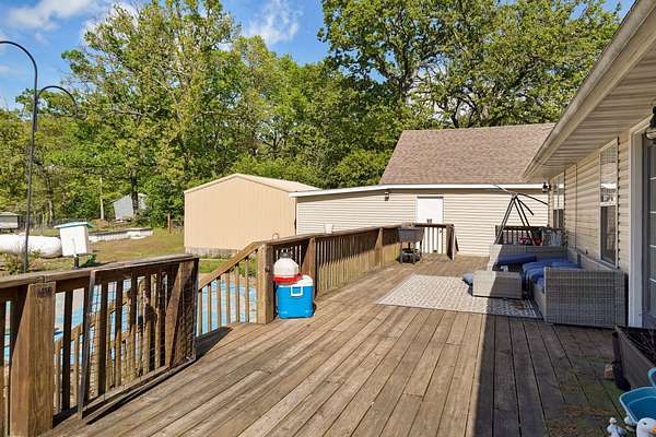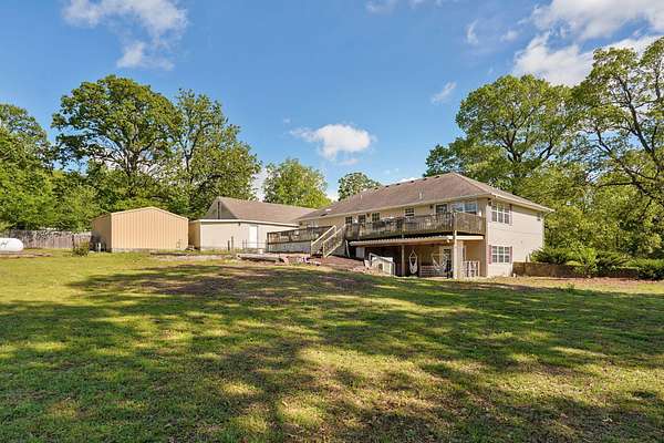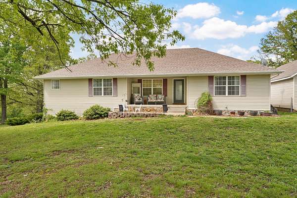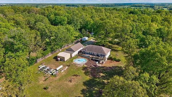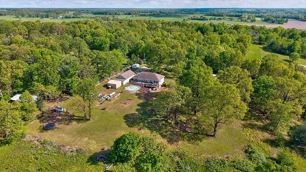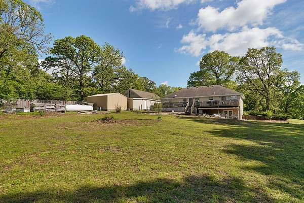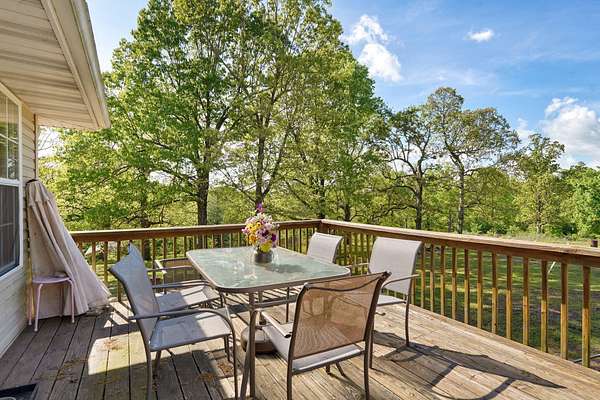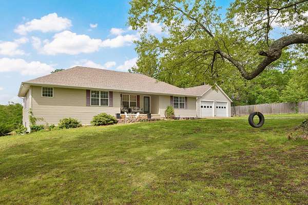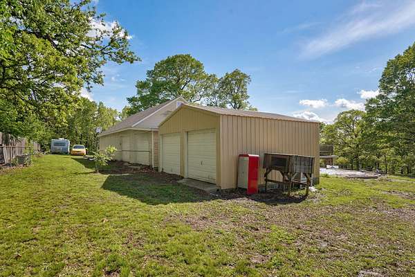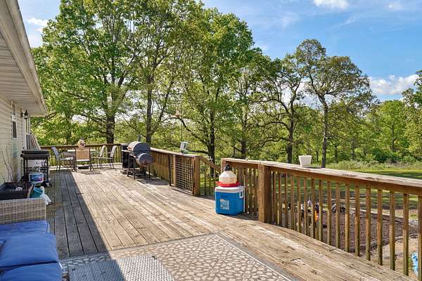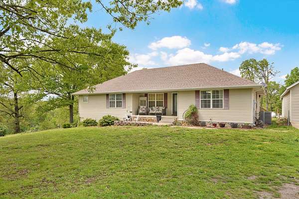 Location, setting, and space all come together on this exceptional 5-acre property. Perched on a hill with a park-like setting and mature oak trees, this home offers both privacy and convenience just minutes from town.The main level features a spacious open floor plan with beautiful hardwood flooring throughout most of the living areas. The kitchen offers abundant cabinet space, granite countertops, double oven and a generous dining area--ideal for everyday living and entertaining. Upstairs includes three bedrooms, two of which are large primary suites.The finished walkout basement offers impressive 10-foot ceilings, a second living area, and multiple additional rooms with closets that can serve as bedrooms, office space, hobby rooms, or storage (non-conforming due to lack of windows). One room also includes a concrete storm shelter. You'll find extensive storage throughout, including a large walk-in storage/closet space.Recent updates include a new AC unit (2025) and there is also a commercial-grade water heater.Outdoor features include a full-length deck perfect for entertaining, a covered patio, fire pit area, and a patio bar that stays. The property offers abundant wildlife, including deer and turkey, adding to the peaceful country setting.Additional highlights include a large detached garage/workshop with space for up to 5 vehicles, plus an additional outbuilding for equipment or extra storage.Conveniently located just minutes from town with easy access to Springfield, Branson, and Stockton Lake.