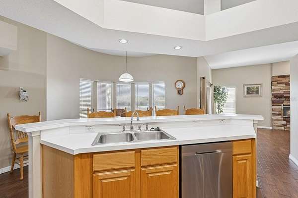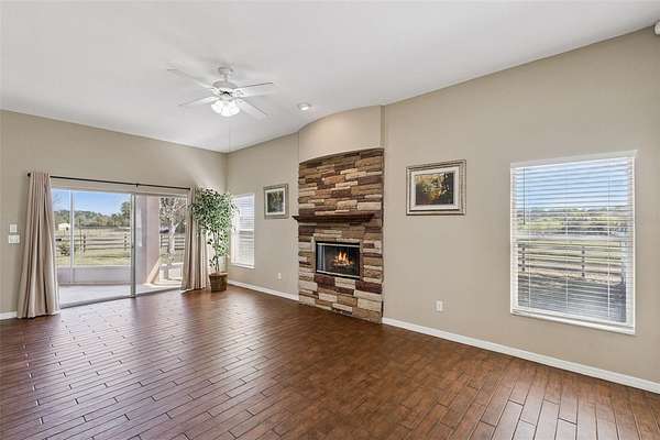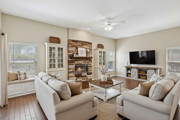A welcoming double-door entry leads into the spacious living area where a stone façade wood-burning fireplace serves as the centerpiece of the great room. The centrally located kitchen features stainless steel appliances and connects easily to the main living spaces—perfect for everyday living and entertaining.