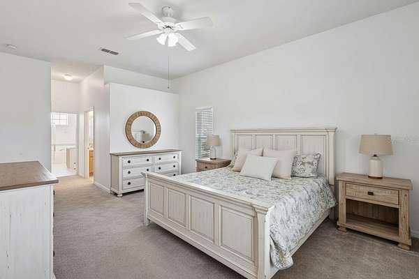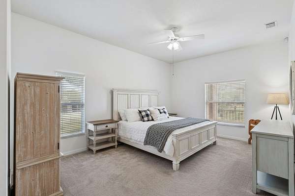 The oversized primary suite offers plenty of space to relax, while the primary bathroom includes a soaking tub, separate shower, and private water closet.