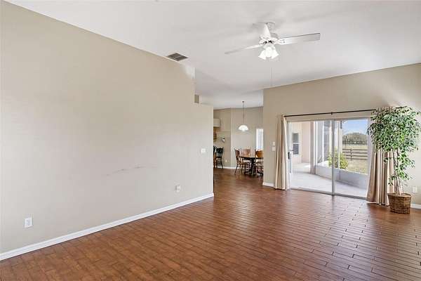 Step outside to the 30-foot-wide screened lanai that spans most of the back of the home—an ideal place to enjoy peaceful mornings or evening sunsets while overlooking open pasture and your own private wetlands behind the property.