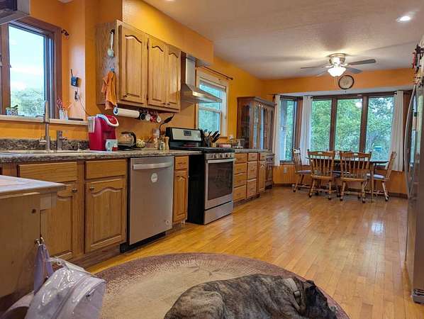 A practical or hobby farm begins with what this moldable 13.95-acre property has to offer. Three lightly rolling grass pastures, 5 acres of timber, over 40 young fruit trees, multiple blueberry/blackberry/raspberry patches, and a modest 3 bay shed in which to work on equipment. Five more acres of forest were added to the parcel in 2022. A fenced and fortified area is currently designated for raising chickens, though buyers can request it be removed. The house is a unique and utilitarian design that spans 2170 sq ft of finished area. The home also contains an unfinished full basement and usable attic space. A 20 x 30 ft addition was constructed in 2024. A new layer of shingles was applied to the entire roof and a large concrete patio was new in 2024 as well. The property backs up to a scenic bike/walking path, offering direct access to outdoor recreation with just a short walk through the forest. With vaulted ceilings, large windows, and an airy layout, this home offers a bright, inviting atmosphere, seamlessly blending indoor comfort with the beauty of the outdoors. This picturesque property features fruit orchards, a peaceful pond and meandering stream, creating a setting that's tranquil and inspiring. Whether you're relaxing on the patio, tending to the gardens or exploring the forested trails, every inch of this property invites you to unwind and reconnect with nature.