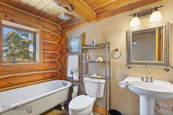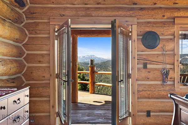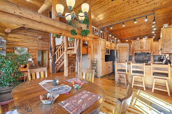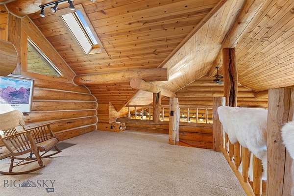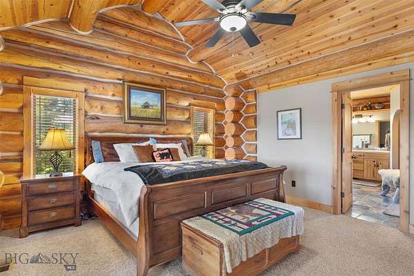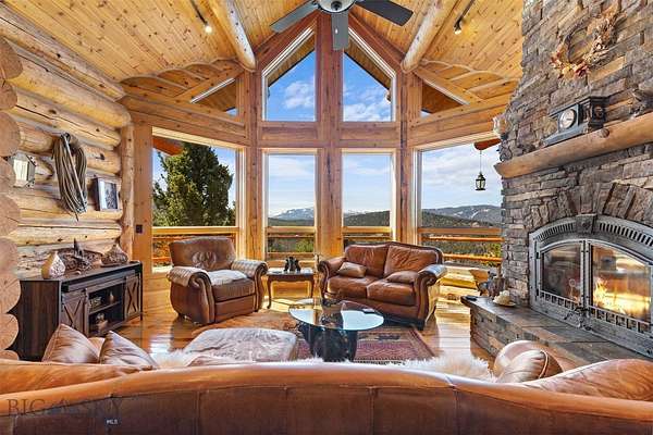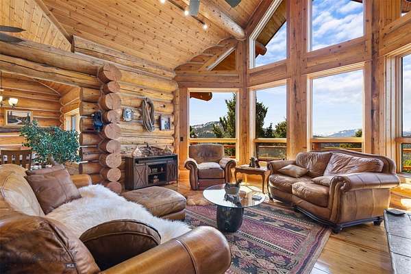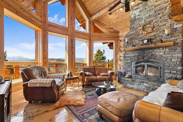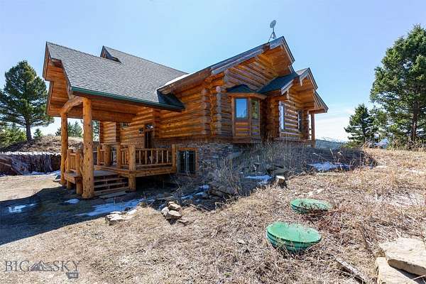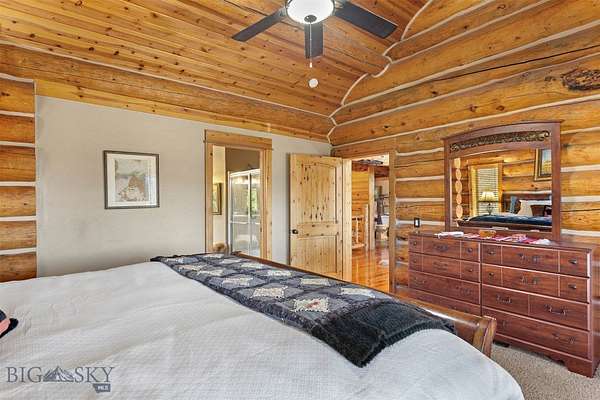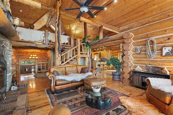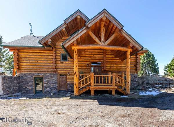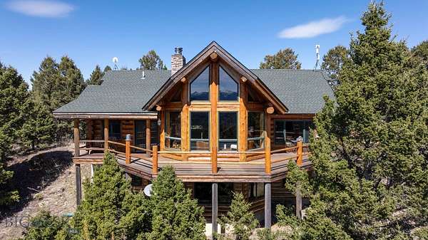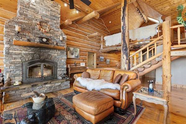 Come home to your Montana Dream log home on over 21 acres in the mountains, where rustic charm meets custom comfort only minutes from Historic Downtown Bozeman. Surrounded by native pines and offering breathtaking mountain views in every direction, this acreage is the epitome of Montana mountain living. The heart of the home centers around the dramatic log framed great room with soaring timber ceilings, a floor to ceiling stacked stone fireplace, and walls of windows that frame the majestic mountain vistas. Warm hardwood floors and custom log accents create a cozy and inviting atmosphere, while the large windows allow the light to fill every room and invites the outdoors in! The gourmet kitchen focus your attention out the windows to the secluded timber views and features wood cabinetry, granite countertops, and stainless appliances - perfect for everything from morning sunlit coffee, to light filled lunches, and intimate dinner parties. The primary bedroom suite is conveniently located on the main level, offering a peaceful retreat with log walls, forest views, and gorgeous vaulted ceilings. Upstairs you'll find a charming loft space accessible via a rustic log staircase with natural wood that adds to the authentic mountain character. The basement level provides excellent additional living space with two finished bedrooms and a full bath, plus an unfinished bedroom/office and open living area that offers endless possibilities for future customization . The expansive wraparound deck is where this place really comes to life, with multiple outdoor spaces that take full advantage of the spectacular mountain views. Adding to the outdoor appeal is a private stocked trout pond on this secluded property, perfect for enjoying this peaceful outdoor mountain environment. All of this is nestled into a private end of the road wooded lot that feels like your own personal forest retreat. You'll have complete privacy while still being convenient to Bozeman, Livingston, and surrounding recreation, creating the perfect balance of mountain retreat and easy accessibility. This isn't just a home, it's your own personal slice of the famous "Big Sky" lifestyle, where days feels like vacations and the views continually take your breath away.