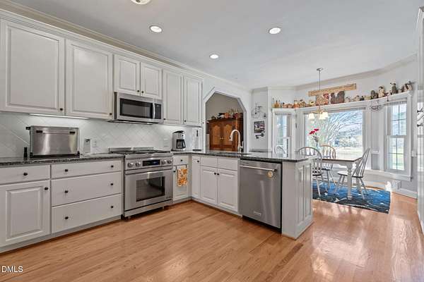 In charming Zebulon, NC, a rare opportunity to own a beautiful home with a serene WATER VIEW on an expansive 2 ACRE lot. This thoughtfully designed residence lives like a ranch, featuring 3 bedrooms on the main level, including a spacious primary suite for convenient, one-level living. Hardwood floors run throughout the majority of the home, creating a warm and cohesive feel from the moment you step inside. The open and inviting layout is filled with natural light, offering comfortable living spaces ideal for both everyday living and entertaining. The kitchen is a standout, showcasing GRANITE countertops, ample cabinetry, and generous prep space--perfect for cooking and gathering. Bathrooms are equally well-appointed with sleek QUARTZ countertops, adding a modern touch throughout. The primary suite offers a peaceful retreat, while additional main-level bedrooms provide flexibility for guests, a home office, or hobbies. Step outside and take in the true highlight of this property--a rare water view that brings tranquility and natural beauty right to your backyard. Relax year-round on the SCREENED PORCH or entertain with ease on the low-maintenance TREX decking. Additional features include low-maintenance vinyl siding, a WALK IN crawl space/storage and plenty of room to spread out, both inside and out. With its desirable ranch-style living, upgraded finishes, and stunning natural setting, this home offers a unique blend of comfort and lifestyle in a sought-after Zebulon location, with easy access to US 64/264. Don't miss your chance to make it yours.