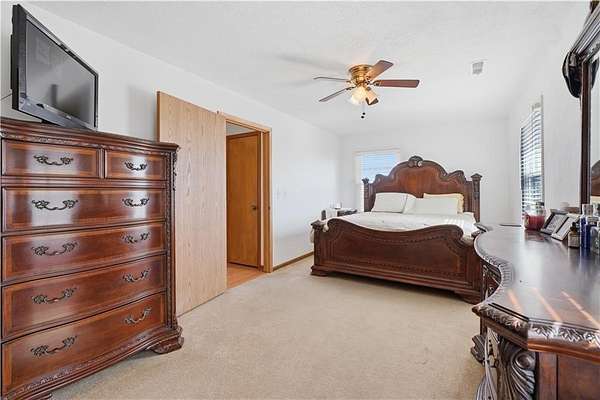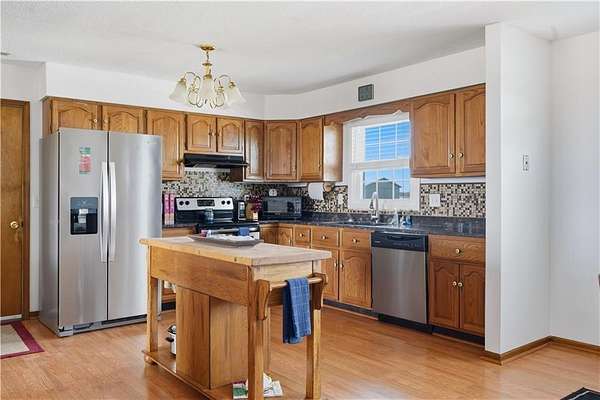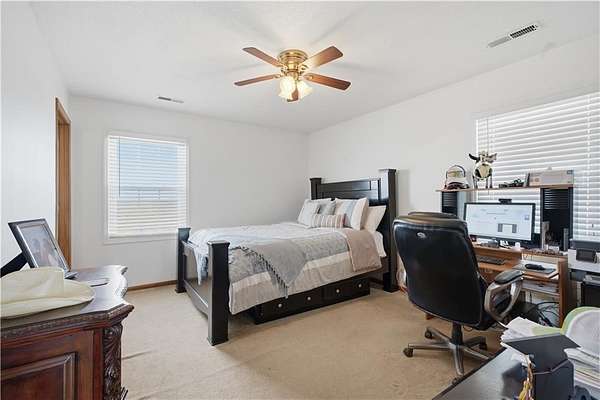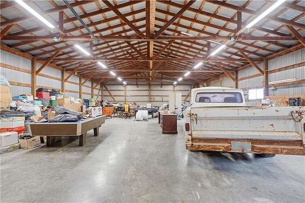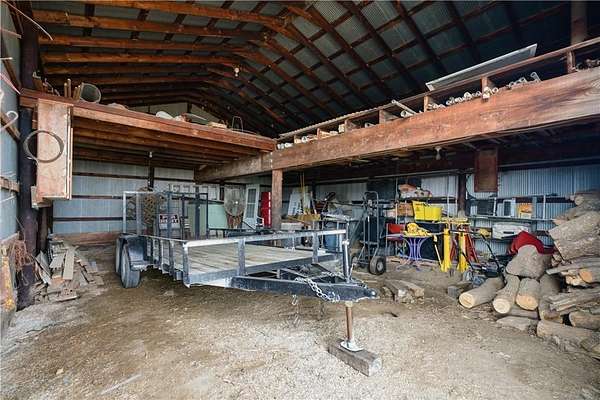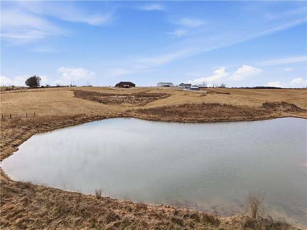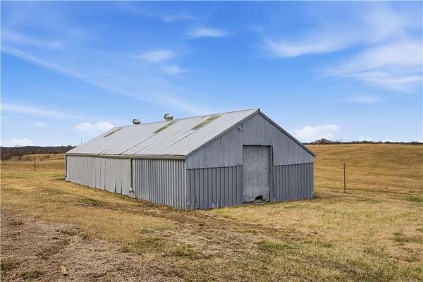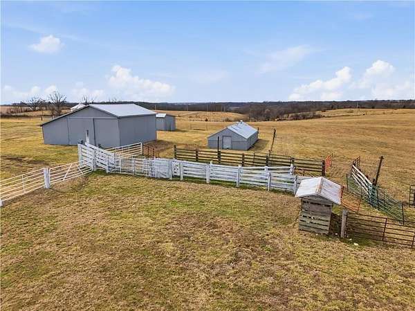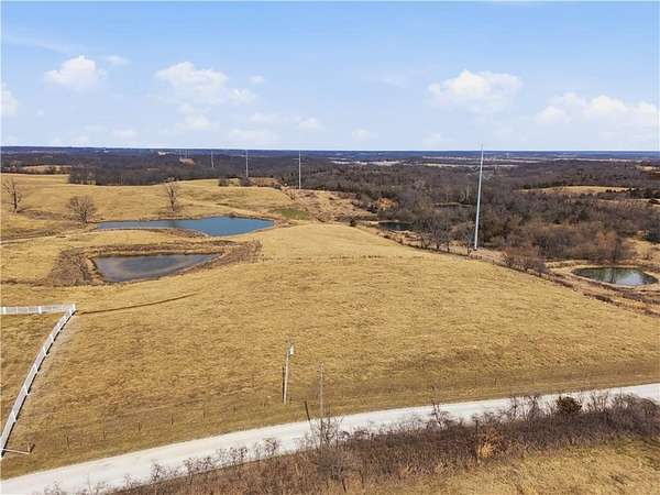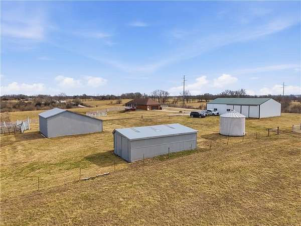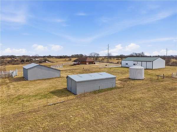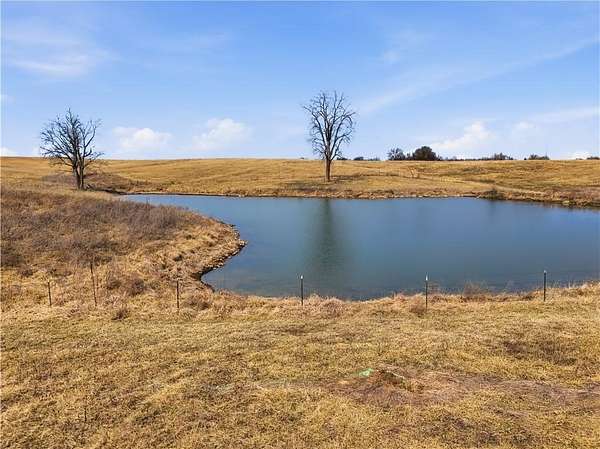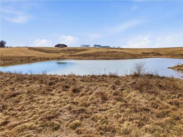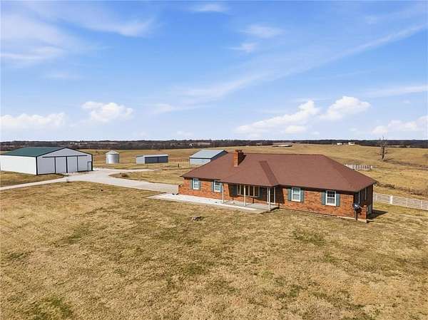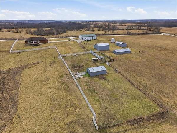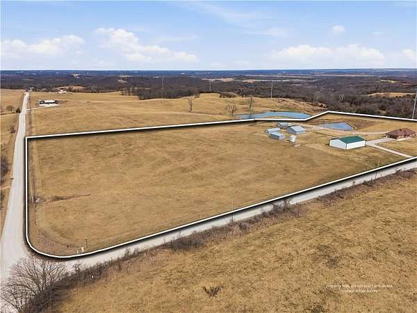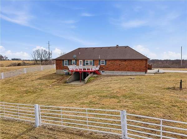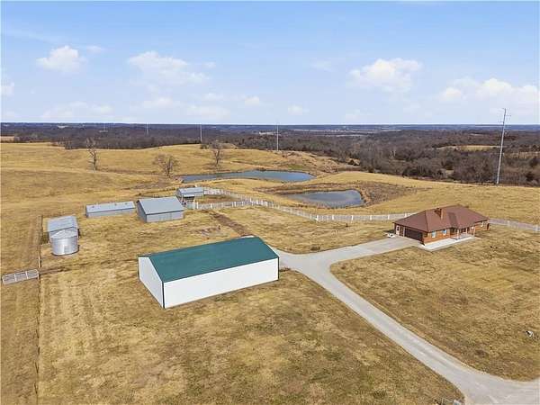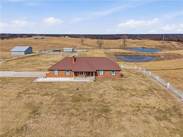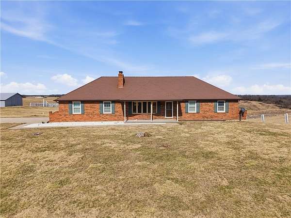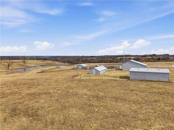 Beautifully maintained ranch home on 19+/- rolling acres featuring 2 main level bedrooms plus 3 non-conforming bedrooms in a fully finished walkout basement complete with a large second kitchen and spacious living room. Meticulously prepped for your comfort and located just 25 minutes from Kansas City, this property delivers the perfect mix of comfort, function, and wide open space. As you drive up, scenic views unfold across your land, buildings, fencing, and stocked pond. The large covered front porch is made for conversations that turn into lasting memories. The main level offers an open concept layout filled with natural light. The kitchen has northern exposure to the property, while the living room features large south-facing windows. Two oversized bedrooms sit on the main floor, including a spacious primary suite with private bath and pond views. A full hallway bath adds convenience. The kitchen includes granite countertops and space for a full size dining table. The walkout basement expands the living space with three additional non-conforming bedrooms and direct outdoor access, ideal for multi-generational living, guests, or entertaining. Formerly a cattle farm, the property is well suited for horses and includes recently painted fencing and gates, refreshed barns, and five total outbuildings. The 40x60 shop with concrete floors and power offers serious workspace. Fencing supports multiple farm animals, including that sought after Highland cow. An additional acreage directly north is available to expand your farm life even more. In the spring, the land comes alive with lush grass and vibrant views. Peaceful country living with city access within minutes. Well cared for. Move in ready. Built for lifestyle and legacy.