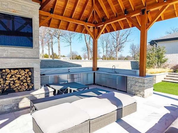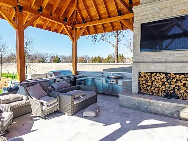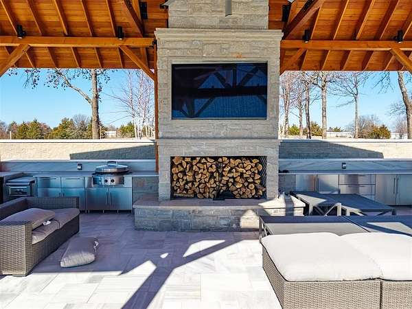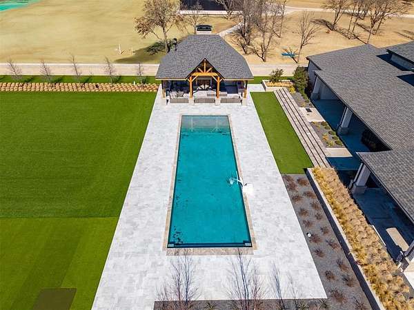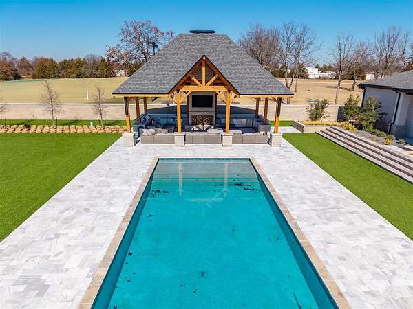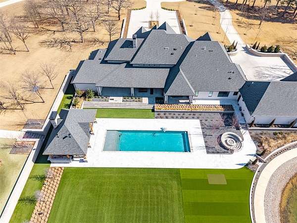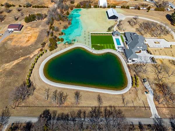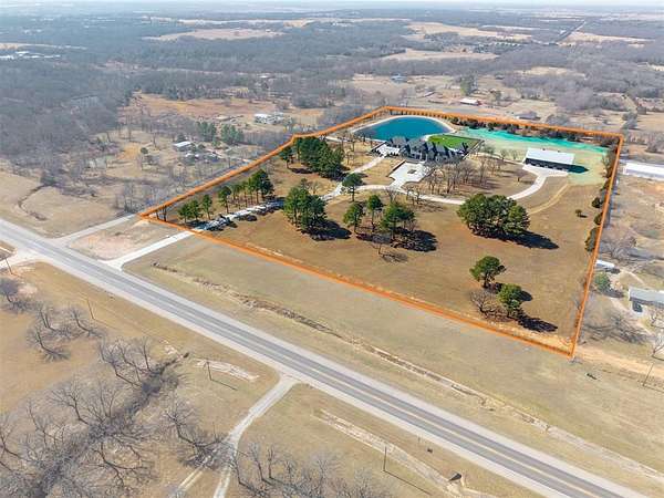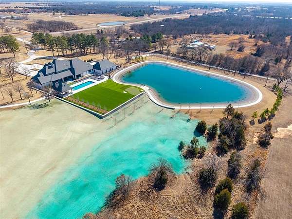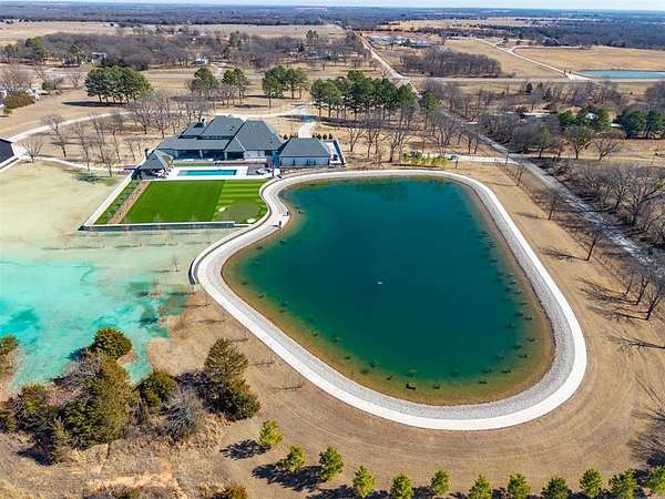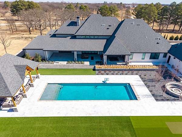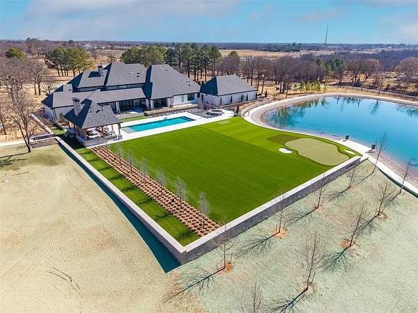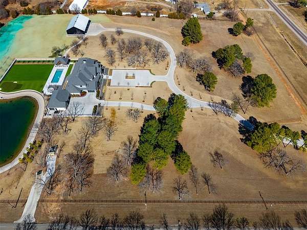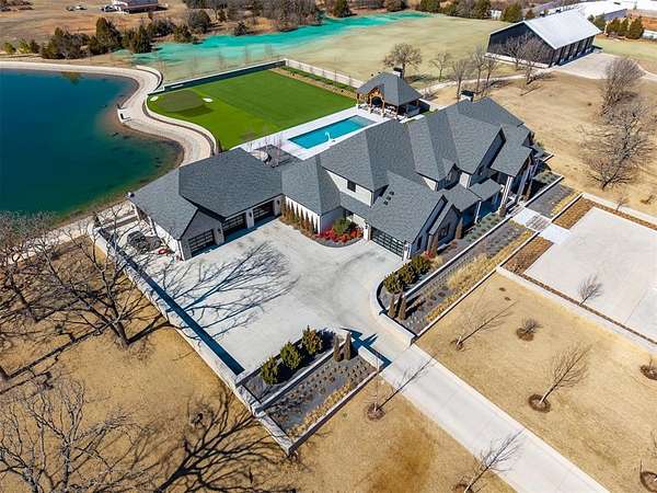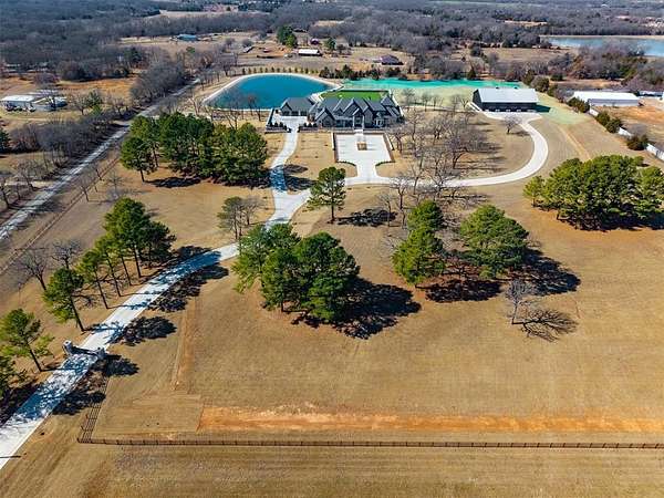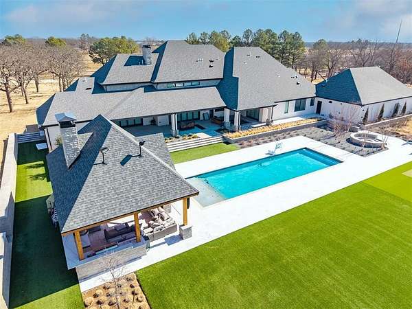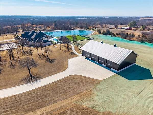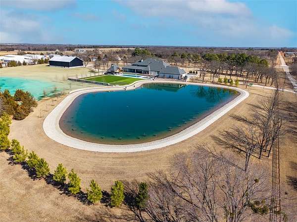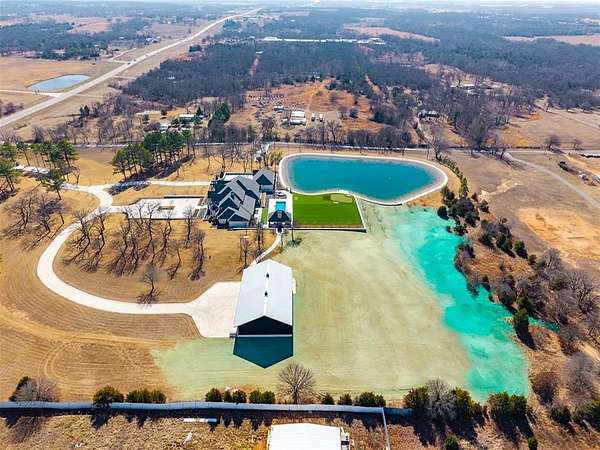 Set behind a sweeping private drive on 21.5 meticulously designed acres, this extraordinary estate delivers approximately 11,000 square feet of refined living space and over 15,000 square feet under roof. Architectural presence is immaculate, with layered rooflines, stone accents, and a motor-court style approach creating a commanding first impression. The 4-bedroom, 4.5-bath residence was built for elevated living and large-scale entertaining, featuring expansive gathering spaces, a grand wood-burning fireplace, private bar and game room, 16-seat theater, and a fully appointed butler's kitchen. Smart home integration provides seamless modern control throughout. Outdoor living rivals private resorts. A pool and hot tub anchor the backyard, complemented by a pergola pavilion with wood-burning fireplace. The professionally installed turf lawn features a custom putting green with bunkers, overlooking a 2-acre geothermal pond fully stocked with fish and surrounded by a curved walking path. Two large irrigation wells support the grounds, while a 6,000 square foot shop offers exceptional flexibility for collectors, equipment, or business operations. Rarely does a property combine luxury residence, recreational amenities, infrastructure, and privacy at this scale. This is a true legacy compound designed for those who expect excellence.