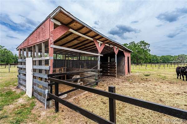 Located just four minutes from the World Equestrian Center, this 6.6+ acre fully fenced flag lot offers the perfect blend of seclusion and convenience. Surrounded by mature trees, the 3-bedroom, 2-bath home features an open floor plan, spacious dining area, and an air-conditioned back porch for added flexible living space. The property is well-equipped with an oversized workshop and RV garage, a 27x22 enclosed garage with 110 & 220 power, a 39x16 covered RV hookup with 30-amp service, a 3-stall pole barn, and a unique air-conditioned shed great for additional living, storage or a workspace. A shingle roof approx. 8-9 years old, Flood Zone X location, and seller-paid solar panels at closing add peace of mind and value. This rare Ocala property delivers space, versatility, and proximity to one of the area's most sought-after destinations.