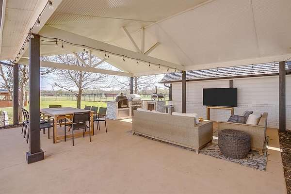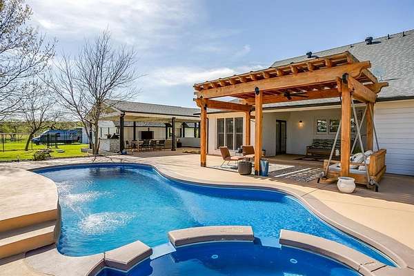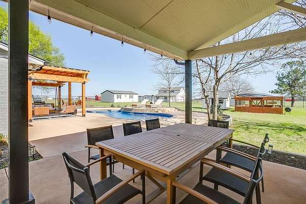 Experience the perfect blend of country living & modern convenience w this beautifully updated farmhouse on 4± acres just minutes from town. Located 10 minutes from Old Town Burleson & H-E-B & 8 minutes from Chisholm Trail Pkwy, this property offers peaceful surroundings w an easy commute to Fort Worth. The charming farmhouse features standout curb appeal w black shutters, painted gutters, & a large wraparound porch perfect for relaxing. Inside, the 3bed, 2.5bath home offers a spacious floorplan w a large living area, plantation shutters, wood-burning fireplace w custom mantel, formal dining, breakfast room, mudroom, & office w built-ins currently used as a climate-controlled wine room. The kitchen overlooks the backyard & features double ovens, farmhouse sink, marble countertops, abundant storage, & herringbone tile floors. The first-floor primary suite includes a jetted tub, separate shower, & dual sinks. Upstairs is 2bed w large closets & a full bath. Step outside to a backyard retreat featuring a fiberglass pool (2022), stained concrete decking, covered outdoor living area w vaulted ceilings, outdoor kitchen w grill and refrigerator, & cedar pergola w fan & custom daybed swing. Enjoy the sunsets & evenings by gathering around the custom fire pit area w wood decking, an ideal place to end the day roasting s’mores or sharing stories. Beyond the pool area, is a custom enclosed cedar garden w raised beds & built-in misting system, perfect for growing your own fruits & veggies. The acreage is beautiful w pipe & no-climb fencing, an additional cross-fenced pasture w custom gates & a shelter w dedicated feed room for livestock. There is a separate workshop w electricity ideal for hobbies, projects, or additional storage. Recent updates include full exterior paint and a new 30-year composition roof (2025). This is the perfect opportunity to enjoy the charm of country living without sacrificing location, comfort, or convenience. WILL BE SOLD FULLY FURNISHED.