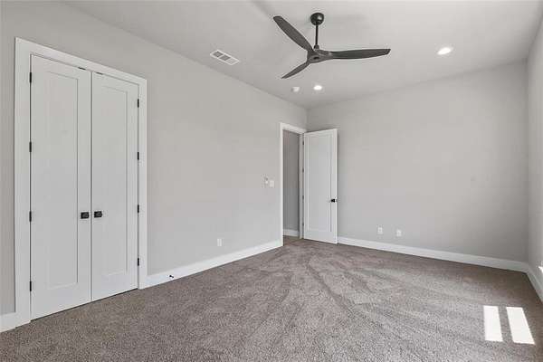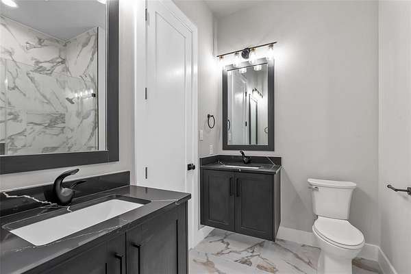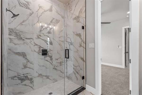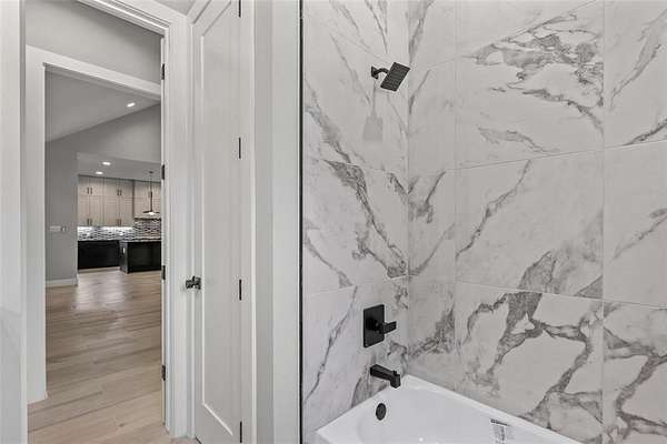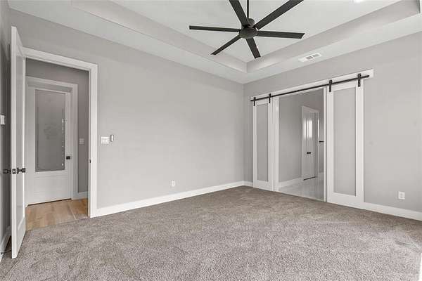 The private primary suite provides a relaxing retreat with tray ceilings, a spa-inspired bath, dual vanities, soaking tub, separate shower, and a generous walk-in closet. Additional bedrooms are well-sized with flexible space for guests, office, or game room.