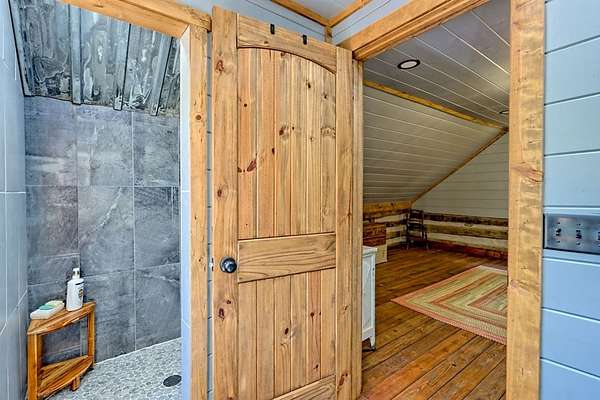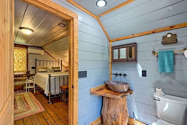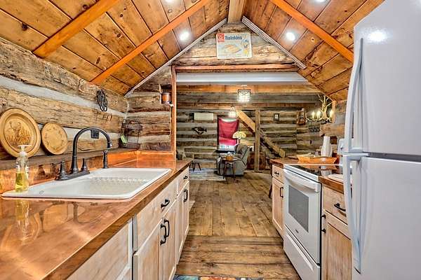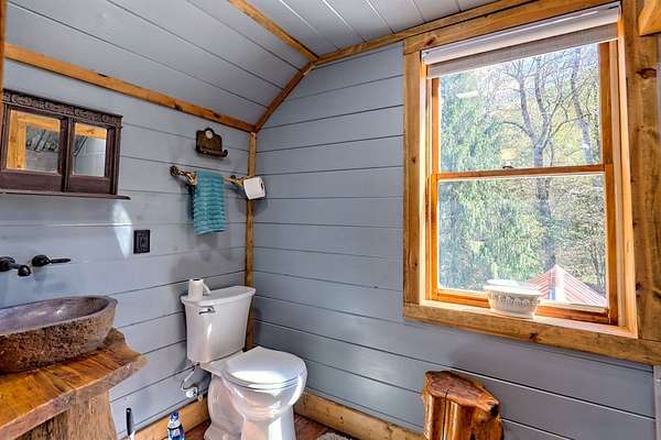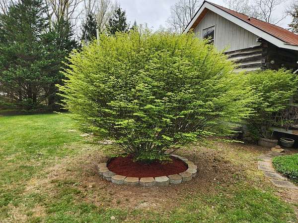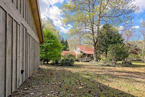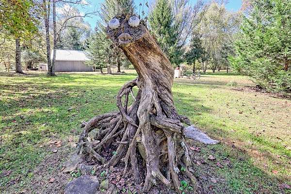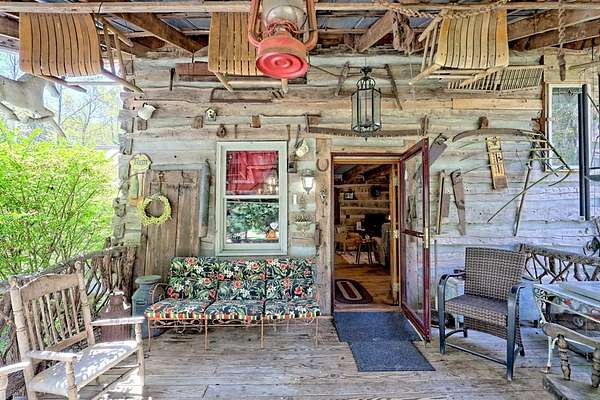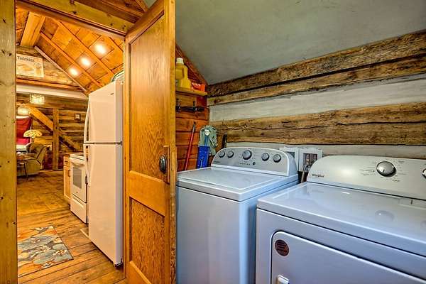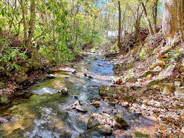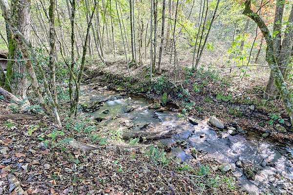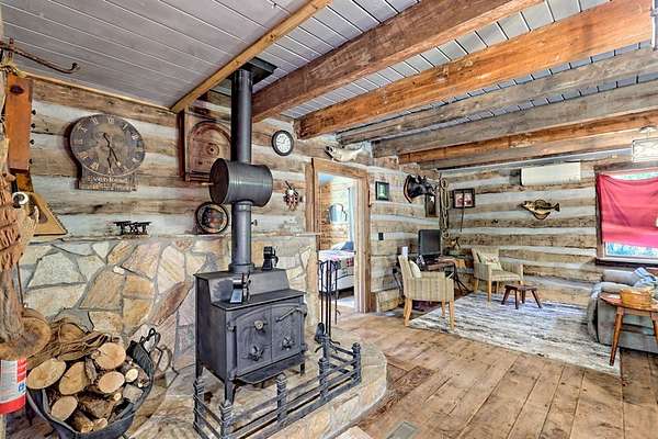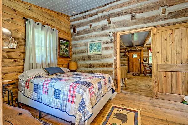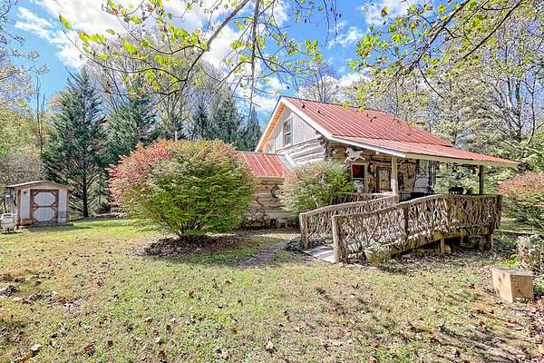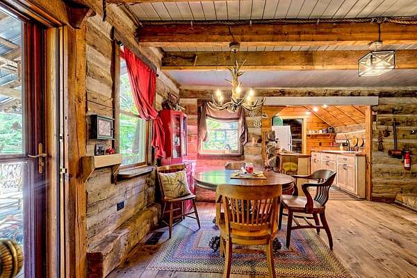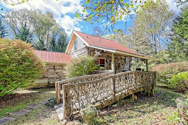 Nestled at the end of a long, tree-lined driveway, Twin Oaks Heritage Cabin is a charming, fully furnished 2-bedroom, 2-bathroom hand-hewn log cabin set on 3.95 peaceful acres along Muskrat Creek. Steeped in history, this 1800s treasure began as two separate cabins on a Tennessee plantation, professionally disassembled with every original log carefully numbered, then transported and reassembled into one unified home with an added second floor and bottom floor bedroom. Thoughtfully updated by its current owners, the cabin combines modern conveniences with the warmth of traditional log cabin living. Renovations include a completely new kitchen, new bathrooms on each floor — the main level shower featuring locally found Staurolite "Fairy Crystals" set into the pebble tile flooring — and a converted pantry and laundry room. Stay cozy with a wood-burning stove and efficient mini-splits, with a wood central furnace in the attached furnace room available as backup during inclement weather. Covered porches invite you to relax and take in the stunning mountain views, while the grounds tell a story all their own: a frog pond fed by a smaller creek teems with tadpoles each spring, live Christmas trees planted over the years dot the landscape, and productive red raspberry vines, asparagus spears, and a generous bed of garlic return faithfully each season. The property also features a gray-stained 27x24 detached garage/workshop, an outbuilding, and a metal carport. With approximately 500 feet of frontage on Muskrat Creek — a flowing trout stream originating from the upper mountain range — level terrain, and unrestricted land surrounded by mountain views, this is a must-see in person to truly appreciate its charm and timeless beauty. A complete property history and feature list are available upon request. Don't miss this opportunity to own a truly unique mountain retreat!