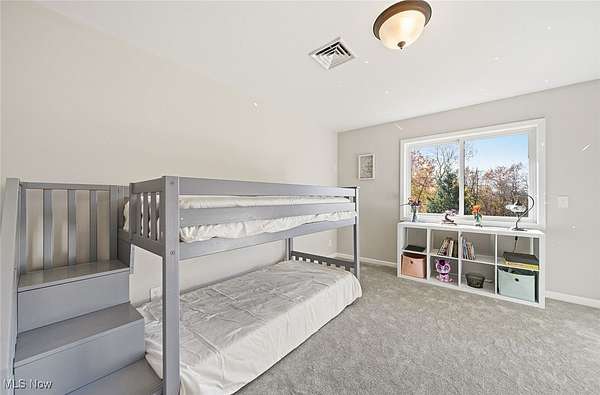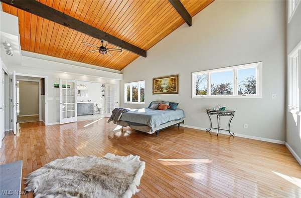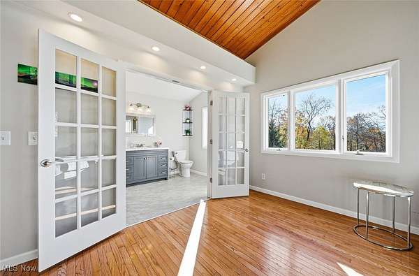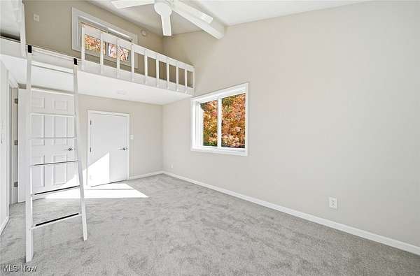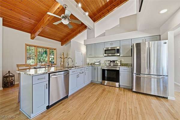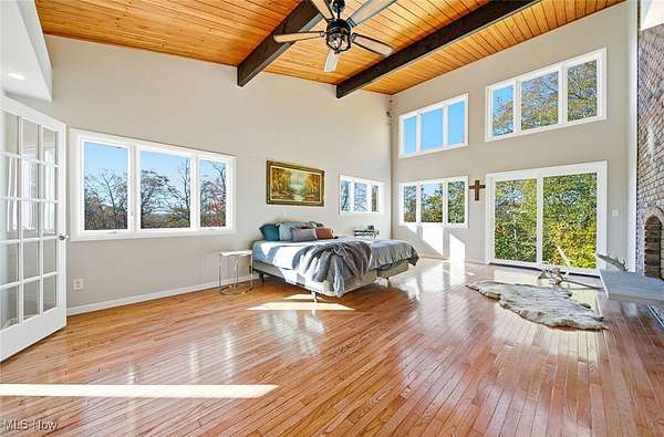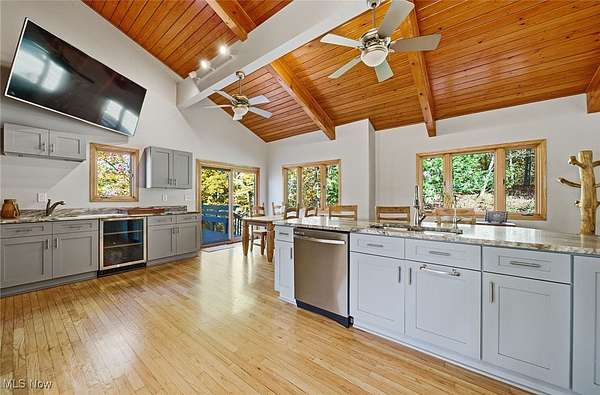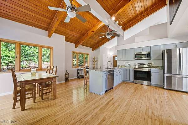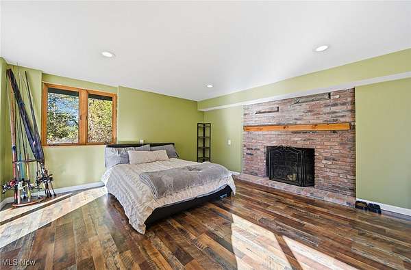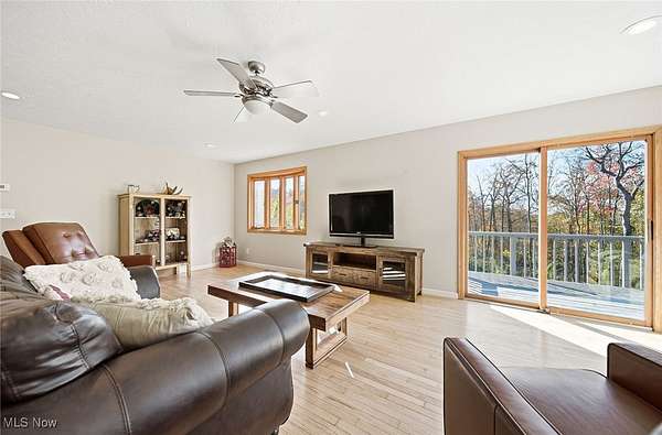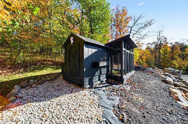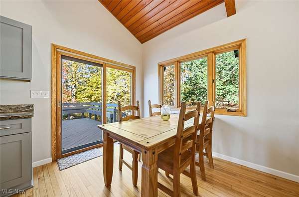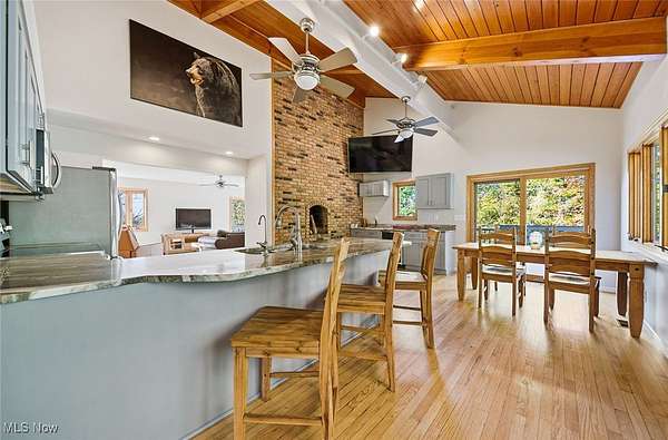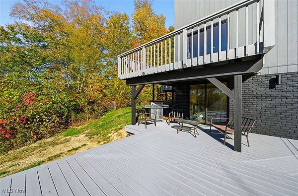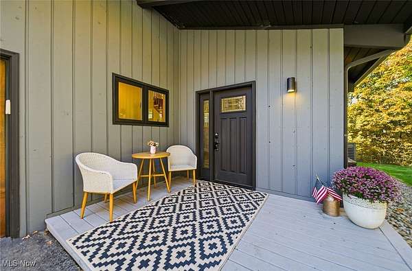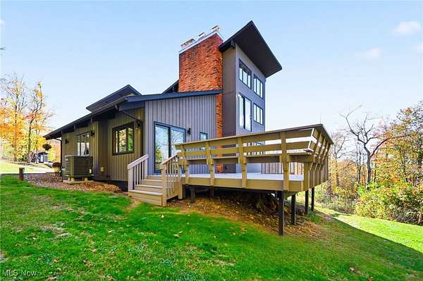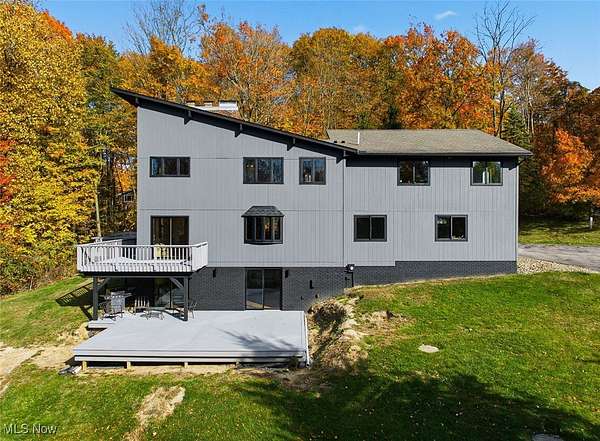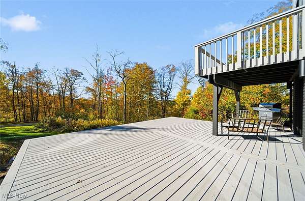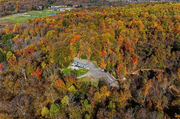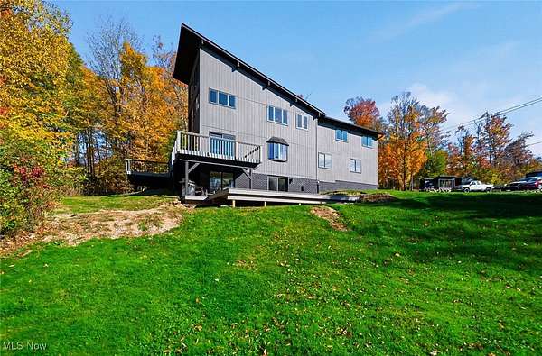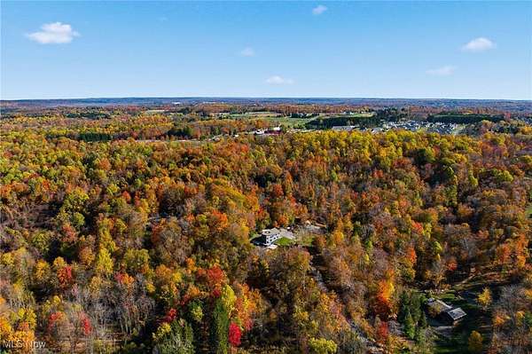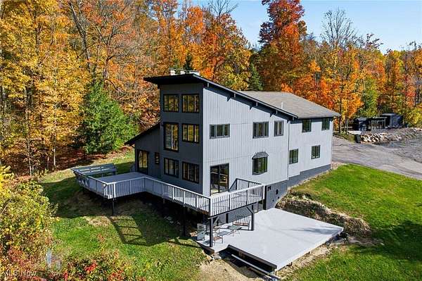 Architecturally striking, 4 bedroom, 3.5 bath, multi-level home sits on over 9 acres of private, wooded land with a layout that maximizes natural light & scenic views from every level, with expansive windows and multiple decks that create seamless indoor-outdoor living. The open-concept kitchen is the heart of the home with soaring vaulted ceilings with wood beams, sleek gray cabinetry, stainless steel appliances, large island with seating & extends into the dining area anchored by a striking exposed brick wall showcasing a woodburning fireplace, wet bar area & a set of sliders leading to spacious deck areas, making gathering & entertaining easy. The kitchen/dining area flows into the family room & features an additional fireplace & large windows that frame picturesque wooded views. The expansive primary suite is a true retreat featuring dramatic vaulted ceilings w/exposed beams, a wall of windows showcasing treetop views, brick faced fireplace & French doors that open to the ensuite bath. Two additional bedrooms & a full bath complete the 2nd floor. Additional living space in the spacious LL recreation room (currently being used as a bedroom) offering recessed lighting, brick fireplace & walk-out access to an expansive deck with serene views. Outside is over 9 wooded acres including a 2 car attached garage, a chicken coop & so much more! Recent updates include: replaced furnace & central air, added additional parking pad & built chicken coop (2022), replaced washer, dryer, dishwasher, stove, refrigerator & microwave (2023), completed lower level remodel & added walk out deck, replaced siding on front of house, painted entire exterior & replaced carpet to the bedrooms (2025). Included are all kitchen appliances, washer/dryer & tv mounts. Conveniently located near I-90, I-271, OH-44, restaurants, shopping & other local attractions.